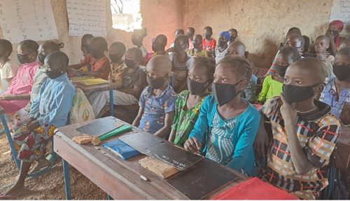 Alumnos/as en la escuela pasarela de Sidio haciendo uso de las mascarillas proporcionadas por el proyecto y atendiendo la lección