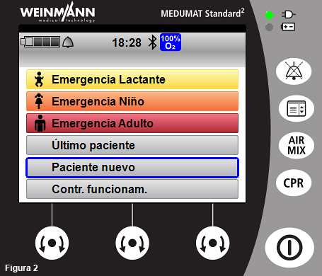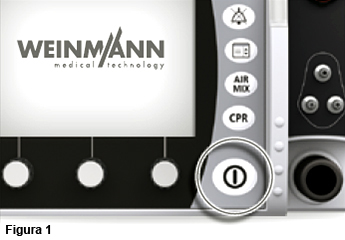 - Encienda el respirador (fig. 1). Asegúrese de que el oxígeno esté conectado y la bala abierta.