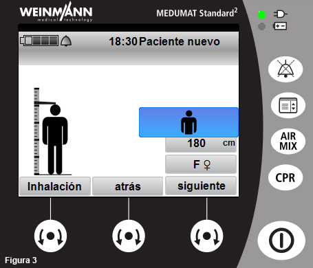 - El dispositivo da la opción de seleccionar el grupo de paciente (adulto, infante o lactante), la altura y el sexo. Posteriormente, seleccione “Siguiente” para elegir el modo ventilatorio (fig. 3).