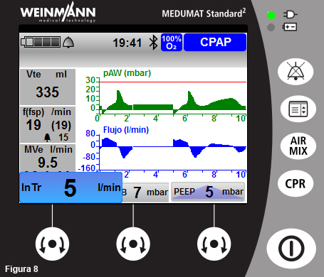 - El disparo inspiratorio se puede modificar con el mando inferior izquierdo. Aparece indicado como “InTr”. Un valor muy sensible puede provocar autodisparos y uno muy duro puede dar lugar a esfuerzos estériles del paciente y desadaptación. Hay que considerar las vibraciones generadas por el movimiento del vehículo. Si dispone de ajuste cuantitativo, antes del traslado 2-3 l/min es una opción equilibrada pero, para evitar autodisparos, durante el traslado probablemente se requiera ajustar el disparo en torno a 5 l/min (fig. 8).