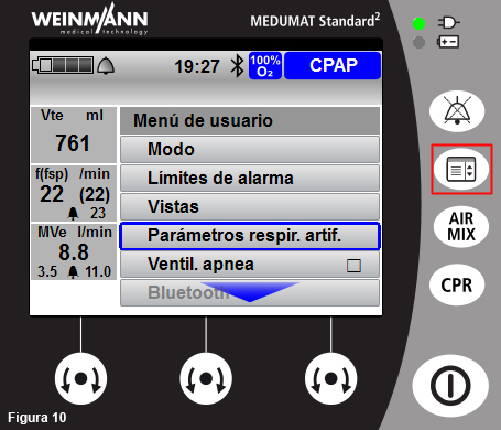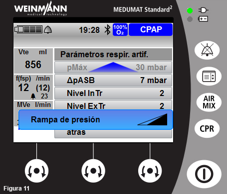 - La rampa se puede modificar accediendo al menú con el botón de menú lateral y eligiendo la opción “Parámetros respir. artif.”, en la que también se pueden fijar el resto de parámetros anteriormente descritos (figs. 10 y 11).