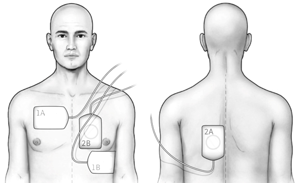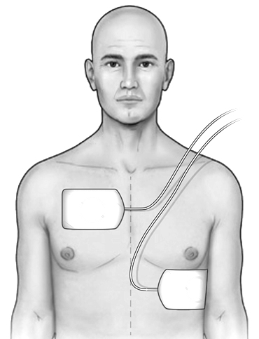 - El electrodo con el dibujo “bajo la clavícula derecha”, se situará en posición horizontal bajo la clavícula derecha. Y el electrodo con el dibujo “bajo la mamila izquierda” se situará en posición horizontal en la línea axilar anterior izquierda 5º espacio intercostal, bajo la mamila.