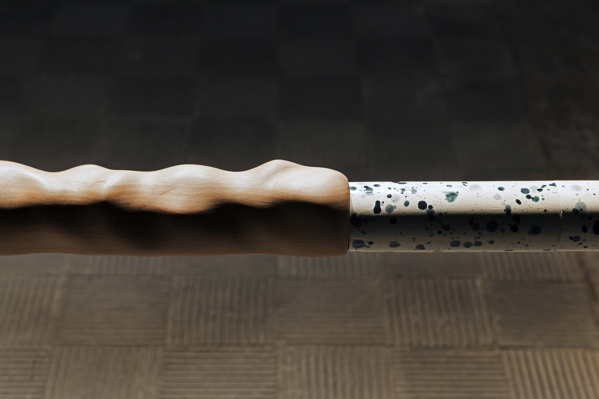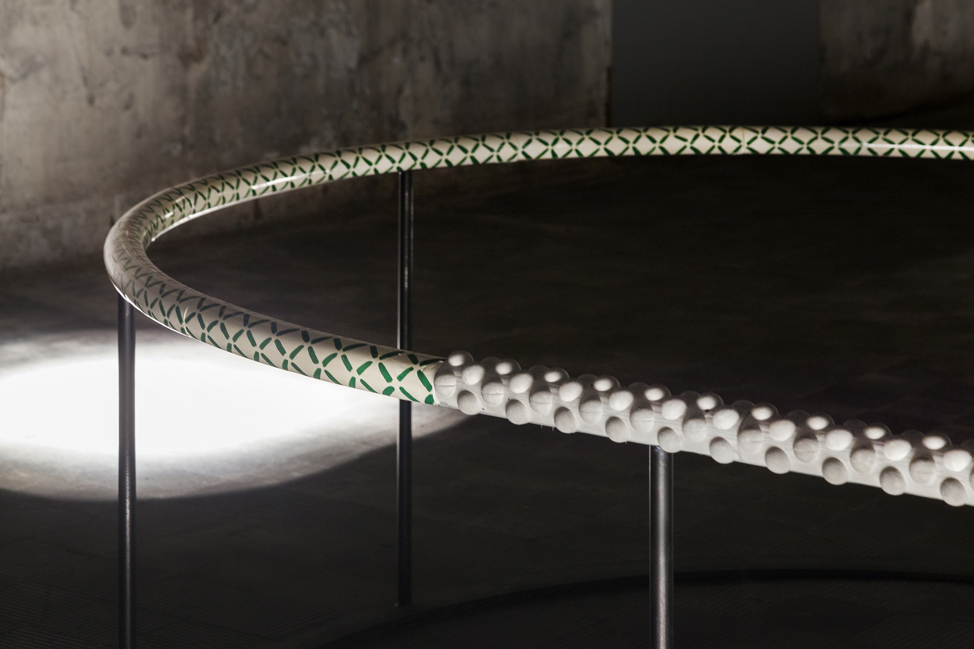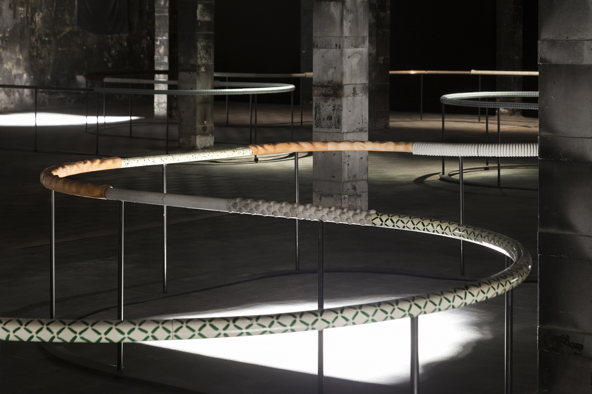 La intervención propone un recorrido por la nave utilizando como guía un pasamanos. Una línea trazada en el plano como un dibujo, que en esta ocasión toma forma escultórica. Su elaboración con distintos materiales, como madera, cemento, corcho, escayola pintada o cobre, pone de manifiesto el interés de la artista por la artesanía y el diseño, y ofrecen al visitante el deleite a la vista y al tacto de los materiales trabajados.