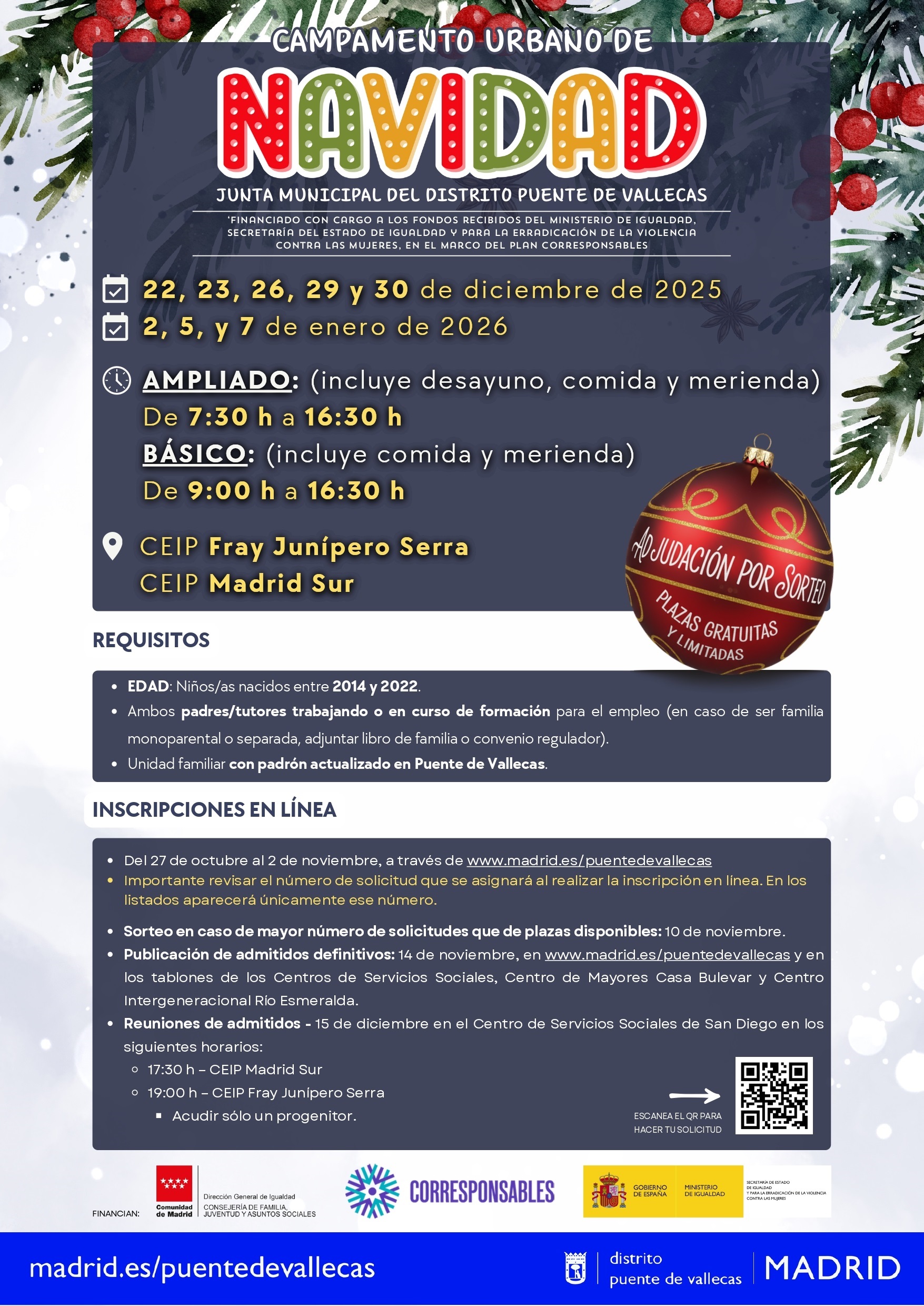 El distrito de Puente de Vallecas abre hoy las inscripciones para participar en los campamentos urbanos de Navidad, dirigidos a menores nacidos entre los años 2014 y 2022. Esta actividad se celebrará en los colegios de Educación Infantil y Primaria Madrid Sur y Fray Junípero Serra en período no lectivo, los días 22, 23, 26, 29 y 30 de diciembre y los días 2, 5, y 7 de enero.