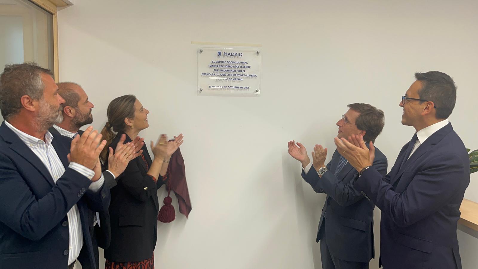 El alcalde de Madrid, Jose Luis Martínez-Almeida, junto al concejal de Villaverde, Orlando Chacón, ha inaugurado esta tarde el Edificio Sociocultural Marta Escudero Díaz-Tejeiro, ubicado en la calle del Calcio, 1. Este espacio alberga servicios orientados al público infantil, familiar y juvenil como un nuevo centro sociocultural, una sala de estudio y la Biblioteca Pública Municipal Francisco Umbral, inaugurada el pasado 20 de junio. Durante el acto, el alcalde ha descubierto una placa conmemorativa junto a los tres hijos de Escudero.