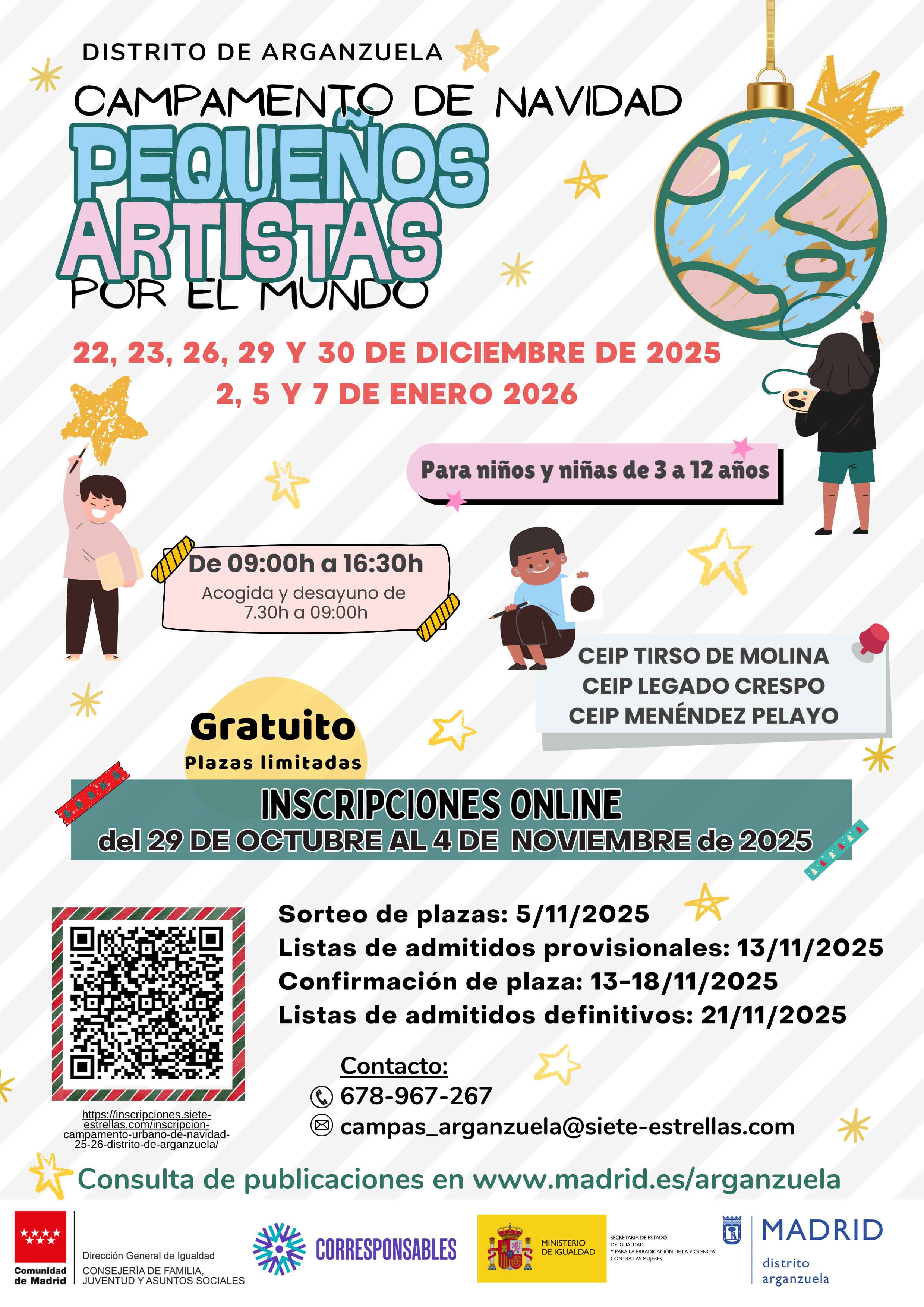 Arganzuela ha abierto hoy el plazo de inscripciones para los campamentos urbanos de Navidad del distrito, que se desarrollarán en los CEIP Tirso de Molina, Legado Crespo y Menéndez Pelayo. Cada centro ofrece 50 plazas, sumando un total de 150 para cubrir el periodo no lectivo de las vacaciones navideñas: 22, 23, 26, 29 y 30 de diciembre y 2, 5 y 7 de enero.