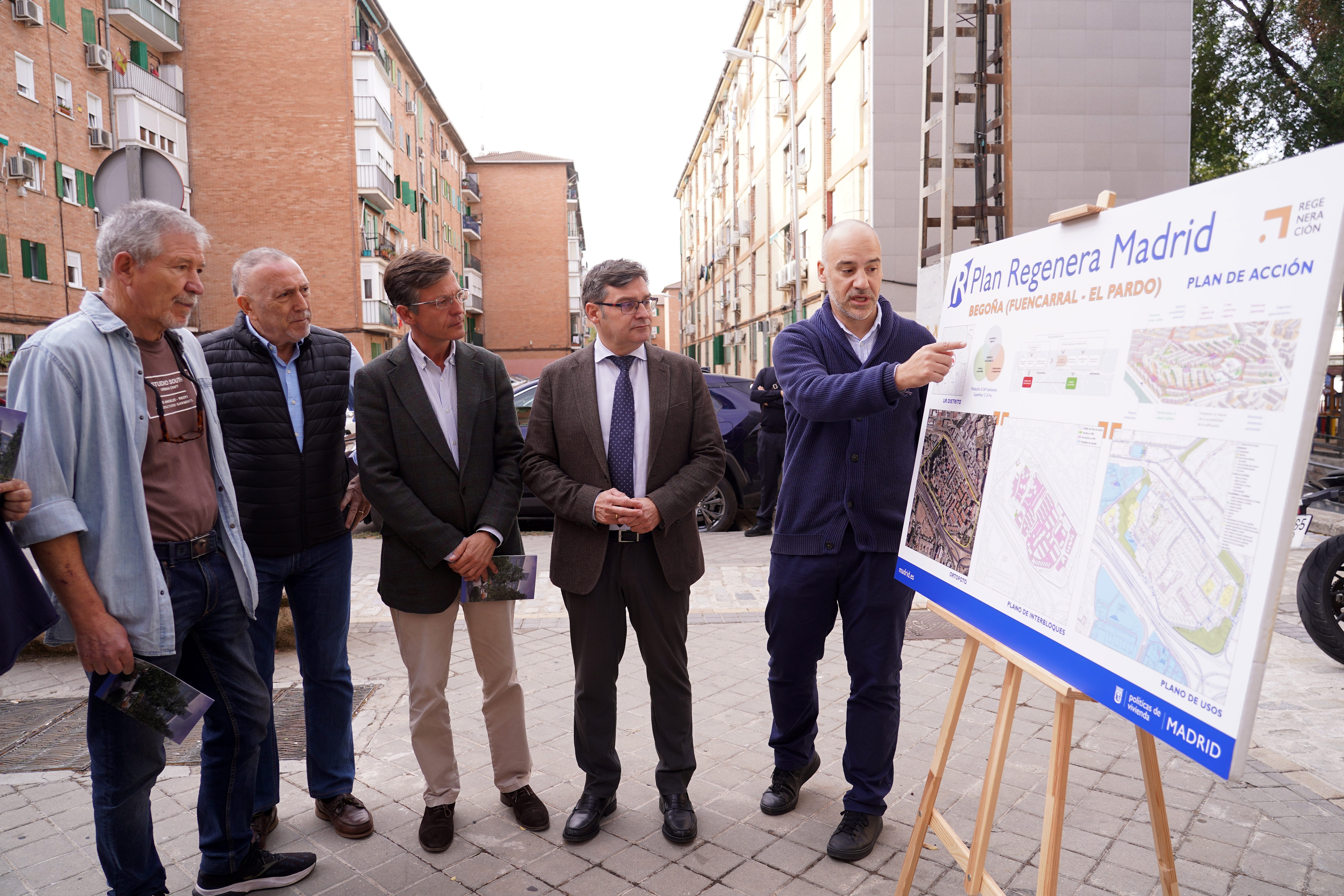 El delegado de Políticas de Vivienda y presidente de la Empresa Municipal de la Vivienda y Suelo de Madrid (EMVS Madrid), Álvaro González, ha visitado esta mañana el barrio de Begoña, acompañado del concejal del distrito Fuencarral-El Pardo, José Antonio Martínez Páramo, y de representantes de la Asociación de Vecinos Begoña, para recorrer las zonas donde se desarrollará el plan de acción previsto dentro del Plan Regenera Madrid.