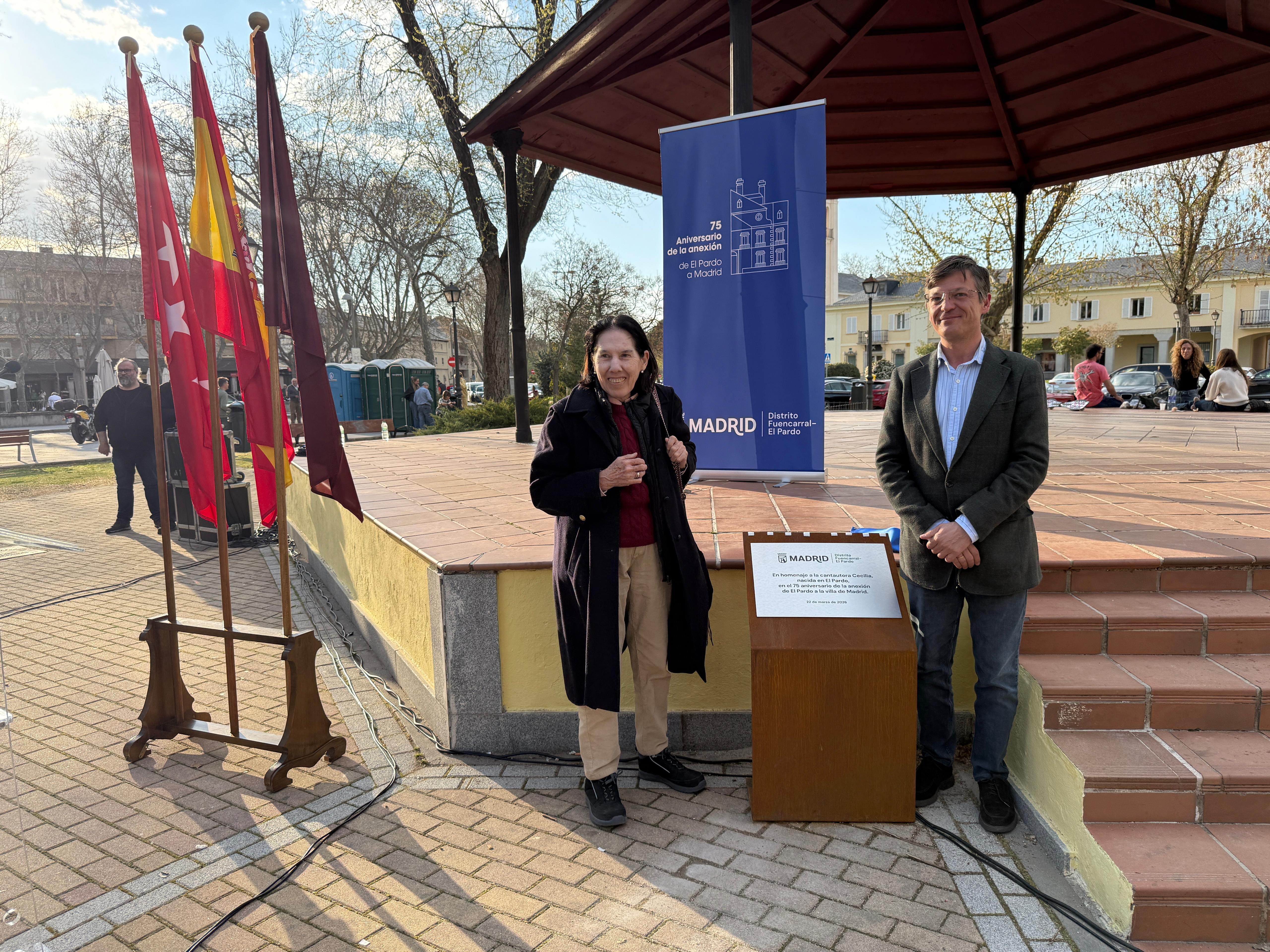El barrio de El Pardo ha rendido esta tarde un homenaje a la cantautora madrileña Cecilia con el descubrimiento de un monolito junto al templete del parque de la Mar Océana, que también llevará su nombre, dando cumplimiento así a la iniciativa aprobada por unanimidad en el Pleno de Fuencarral-El Pardo del mes de marzo. Este homenaje forma parte del programa de actos para conmemorar el 75º aniversario de la anexión de El Pardo a Madrid.