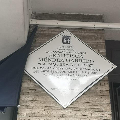 Arganzuela rinde homenaje a la cantaora de flamenco ‘La Paquera de Jerez’Coincidiendo con el Día del Flamenco y el aniversario de su declaración como Patrimonio Inmaterial de la Humanidad, que se celebra mañana, 16 de noviembre, el distrito de Arganzuela rinde desde hoy homenaje a la cantaora Francisca Méndez Garrido, conocida como ‘La Paquera de Jerez’, con una placa recuerdo ubicada en el paseo de Santa María de la Cabeza, 8, donde la artista vivió muchos años durante su estancia en Madrid.