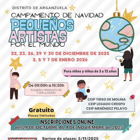 Arganzuela abre las inscripciones para los campamentos urbanos de NavidadArganzuela ha abierto hoy el plazo de inscripciones para los campamentos urbanos de Navidad del distrito, que se desarrollarán en los CEIP Tirso de Molina, Legado Crespo y Menéndez Pelayo. Cada centro ofrece 50 plazas, sumando un total de 150 para cubrir el periodo no lectivo de las vacaciones navideñas: 22, 23, 26, 29 y 30 de diciembre y 2, 5 y 7 de enero.