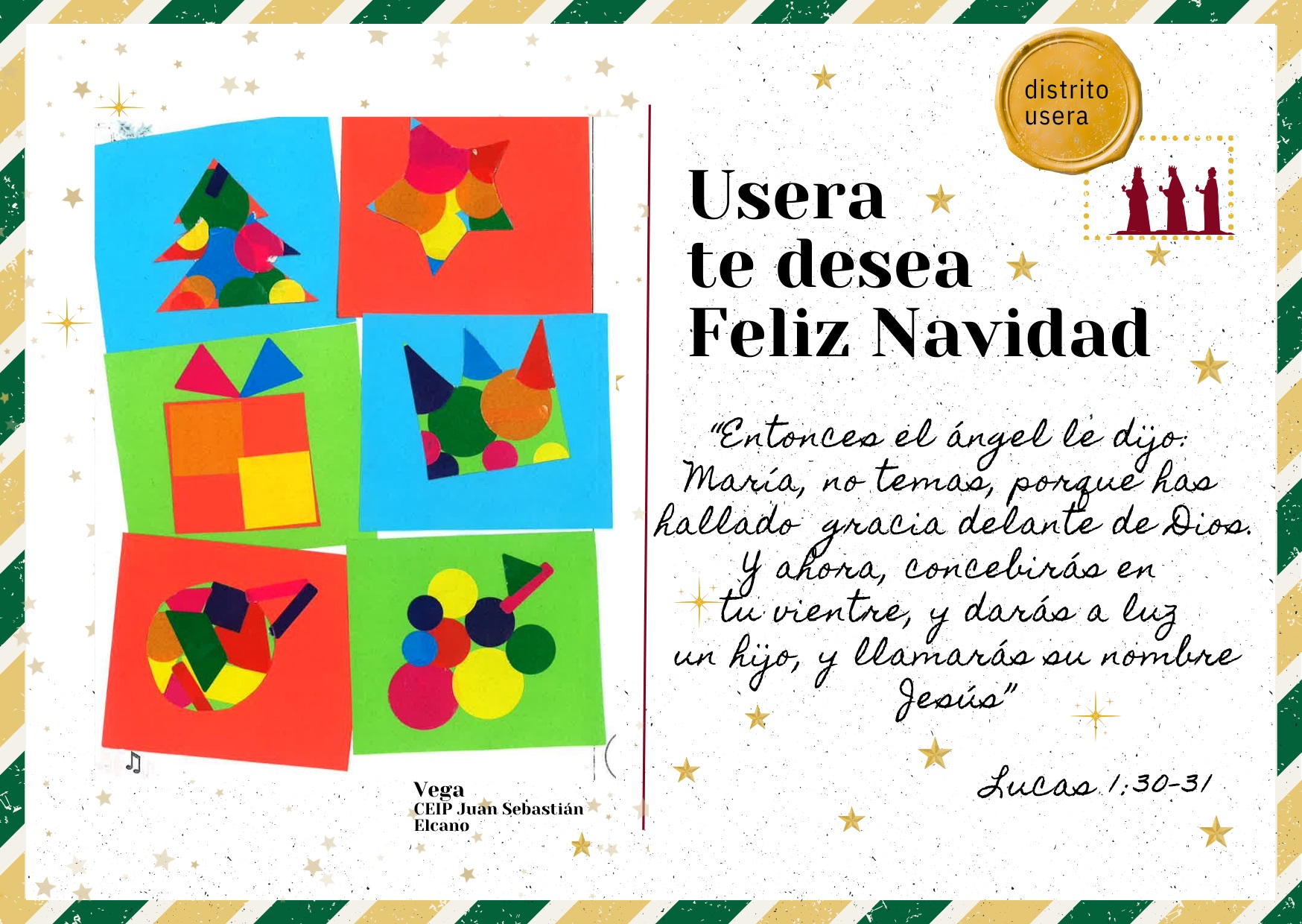 Este año, la felicitación de Navidad de la Junta Municipal de Usera es un diseño de Vega Ferrero, alumna del CEIP Juan Sebastián Elcano, que resultó ganadora del primer premio de tarjetas navideñas en la categoría infantil del año pasado. /