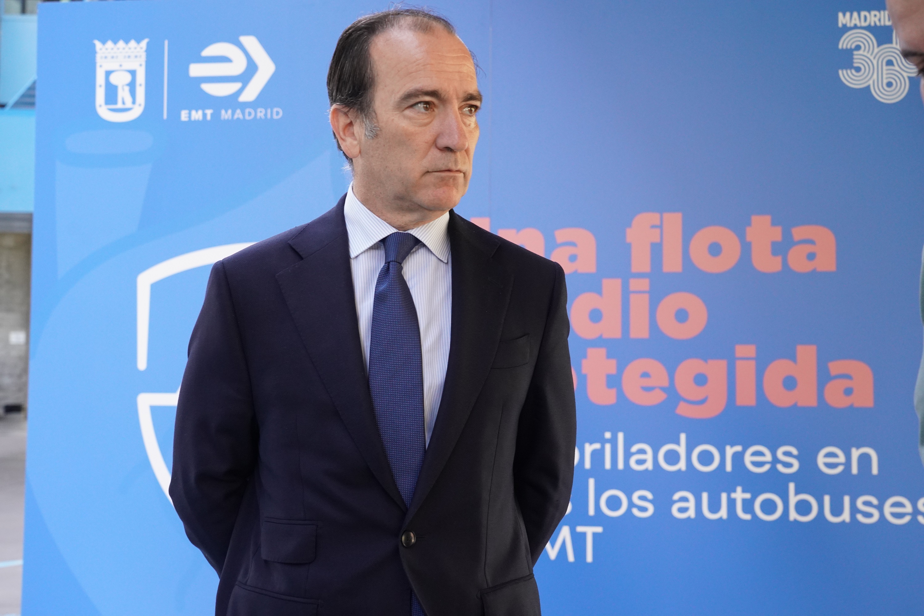 El delegado de Urbanismo, Medio Ambiente y Movilidad, Borja Carabante, ha presentado esta mañana el plan del Ayuntamiento de Madrid para convertir los 2.100 autobuses de la empresa pública municipal en espacios cardioprotegidos.