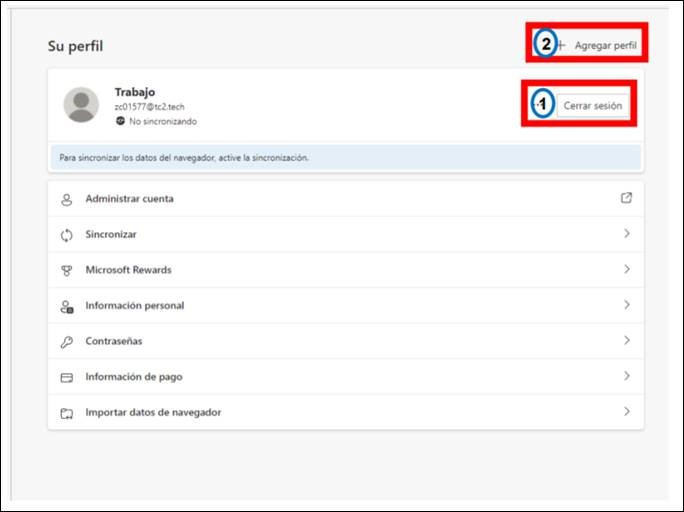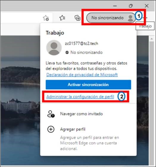 Si el error obtenido es el indicado en el apartado anterior, abra el navegador Microsoft Edge, en la esquina superior derecha haga click en la imagen de perfil (1) y seleccione la opción “Administrar la configuración de perfil” (2) tal y como se indica en la figura.