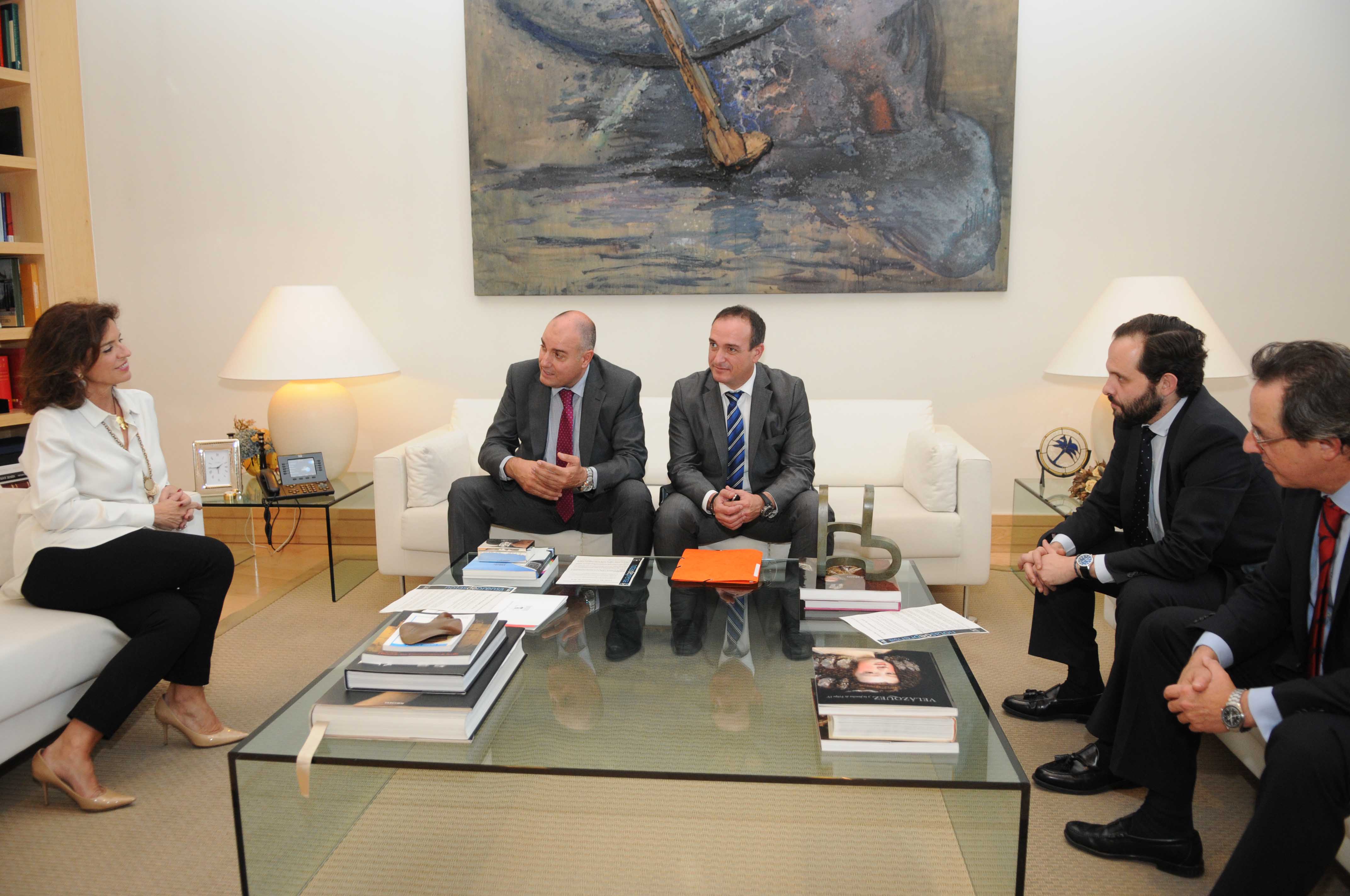 La alcaldesa de Madrid, Ana Botella, durante la reunión que ha mantenido con la Gremial del Taxi y en la que han participado el delegado de Medio Ambiente y Movilidad, Diego Sanjuanbenito, y el presidente de la Gremial, Julio Moreno.