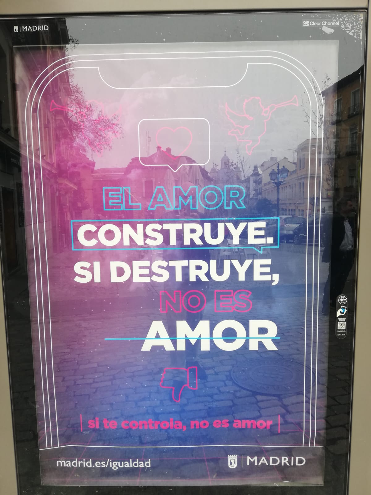 El Ayuntamiento de Madrid ha puesto en marcha hasta el 17 de febrero una campaña contra la violencia de género entre los adolescentes y jóvenes que busca transmitirles los principios de una relación afectiva basada en el respeto y combatir las actitudes tóxicas y dominantes. Bajo el título ‘El amor construye. Si destruye no es amor’, la campaña tiene como objetivo enviar mensajes que provoquen la reflexión y concienciación sobre actitudes, ideas y conductas que favorecen la aparición de violencia de género en las primeras relaciones sentimentales.