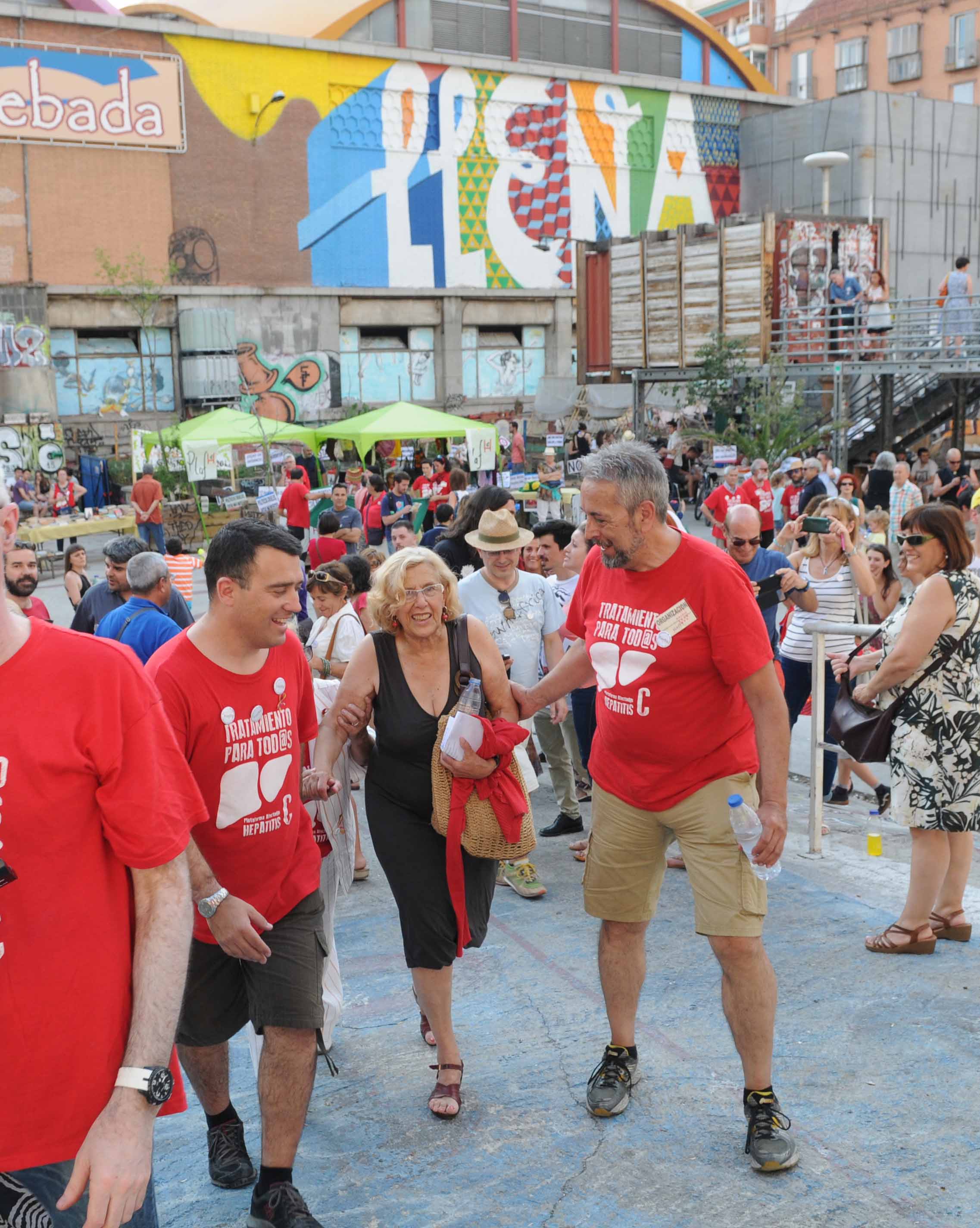 Carmena, acompañada por los tenientes de alcalde Ignacio Murgui y Mauricio Valiente, ha asistido esta tarde al acto solidario organizado por la Plataforma de Afectados de la Hepatitis C. Talleres, poesía y música han ocupado por un día los Campos de la plaza de la Cebada para llamar la atención, esta vez de forma lúdica, sobre los problemas de este colectivo, que, desde su creación en septiembre de 2014, demanda "un tratamiento para todos". Carmena ha mostrado su apoyo total a las peticiones de los enfermos: que ninguna personas con Hepatitis C se quede sin atender por las autoridades sanitarias. Además ha reclamado al Gobierno central que garantice que los medicamentos imprescindibles para la curación lleguen a todas las personas que los necesitan.