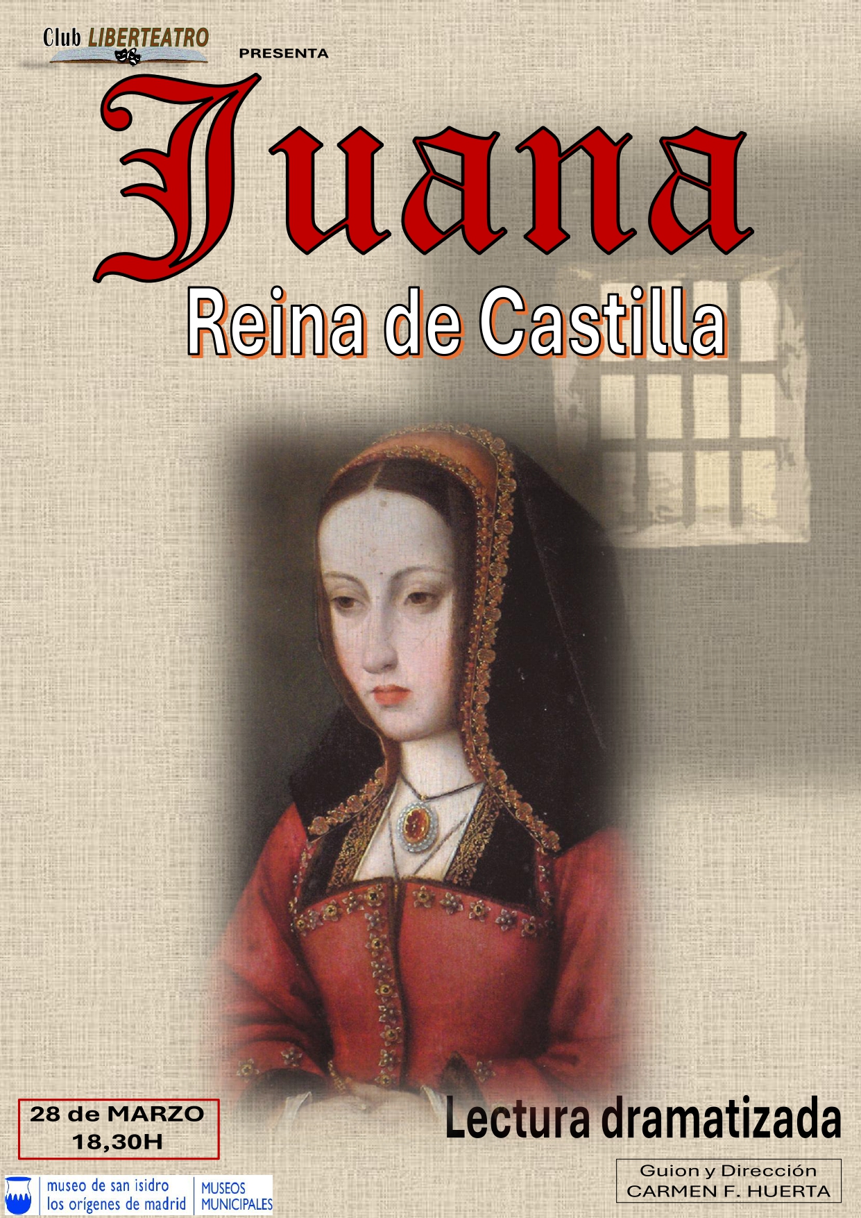 El Museo de San Isidro. Los Orígenes de Madrid y el Club Liberteatro presentan la lectura dramatizada Juana Reina de Castilla, con guión y dirección de Carmen F. Huerta.