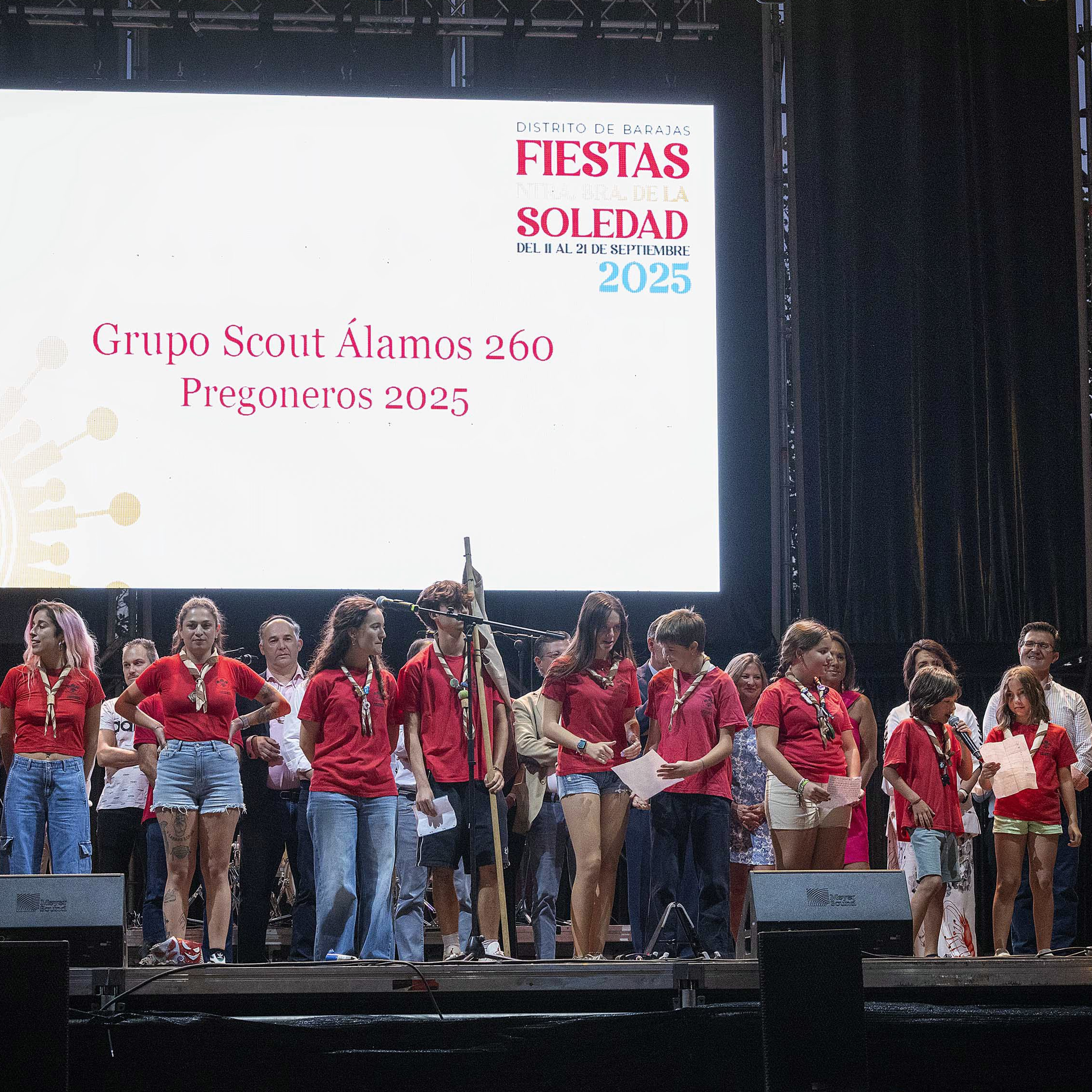 Barajas da el pistoletazo de salida a sus fiestas con el pregón del Grupo Scout Álamos 260Las fiestas de Barajas en honor a Nuestra Señora de la Soledad han arrancado oficialmente esta noche con la lectura del pregón a cargo del Grupo Scout Álamos 260, acompañado por el concejal del distrito, Juan Peña. Un pregón que ha tenido lugar en el recinto ferial Ayerbe tras una chocolatada amenizada por el grupo folclórico Calderón de la Barca.