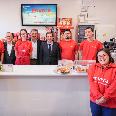 Almeida reivindica el carácter integrador de Madrid y anima a que sea “una ciudad que todos podamos disfrutar al margen de las capacidades”El alcalde de Madrid, José Luis Martínez-Almeida, junto al concejal de Barajas, Juan Peña, ha visitado esta mañana Envera Gastro, la primera cafetería gestionada por personas con discapacidad en una instalación municipal de Madrid. Ubicada en el Centro Cultural Gloria Fuertes del distrito, abrió sus puertas el pasado mes de mayo, mediante concurso público.