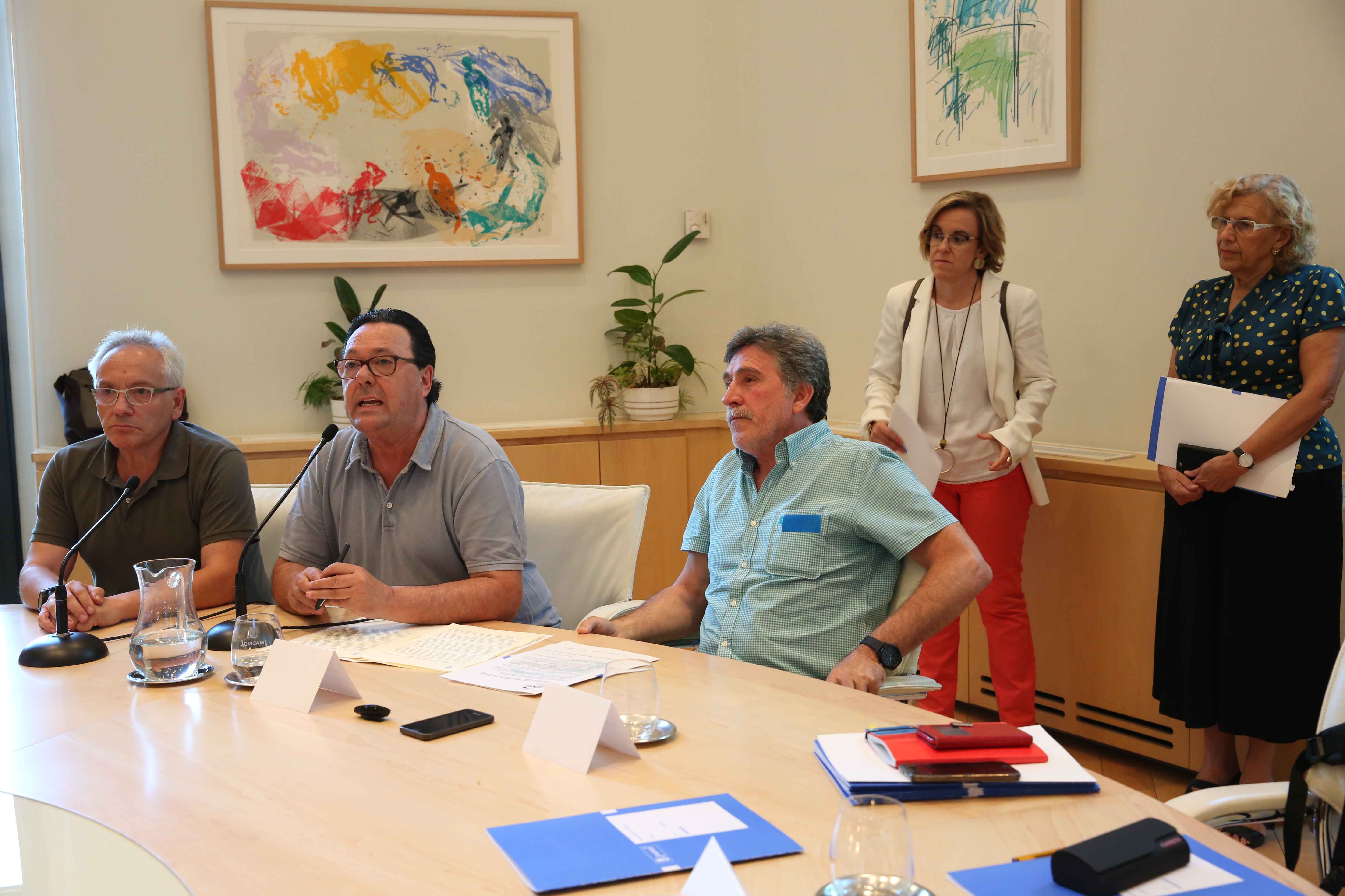 La alcaldesa de Madrid, Manuela Carmena, y la portavoz del grupo municipal socialista, Purificación Causapié, se han reunido esta mañana en el palacio de Cibeles con los líderes del sector de servicios públicos de CC OO, UGT y CSIF para abordar la situación de déficit de personal y de temporalidad que padece el Ayuntamiento de Madrid por el marco restrictivo que impone el Gobierno y por la imposibilidad de ejercer la autonomía organizativa local debido a las imposiciones normativas del Ejecutivo central.