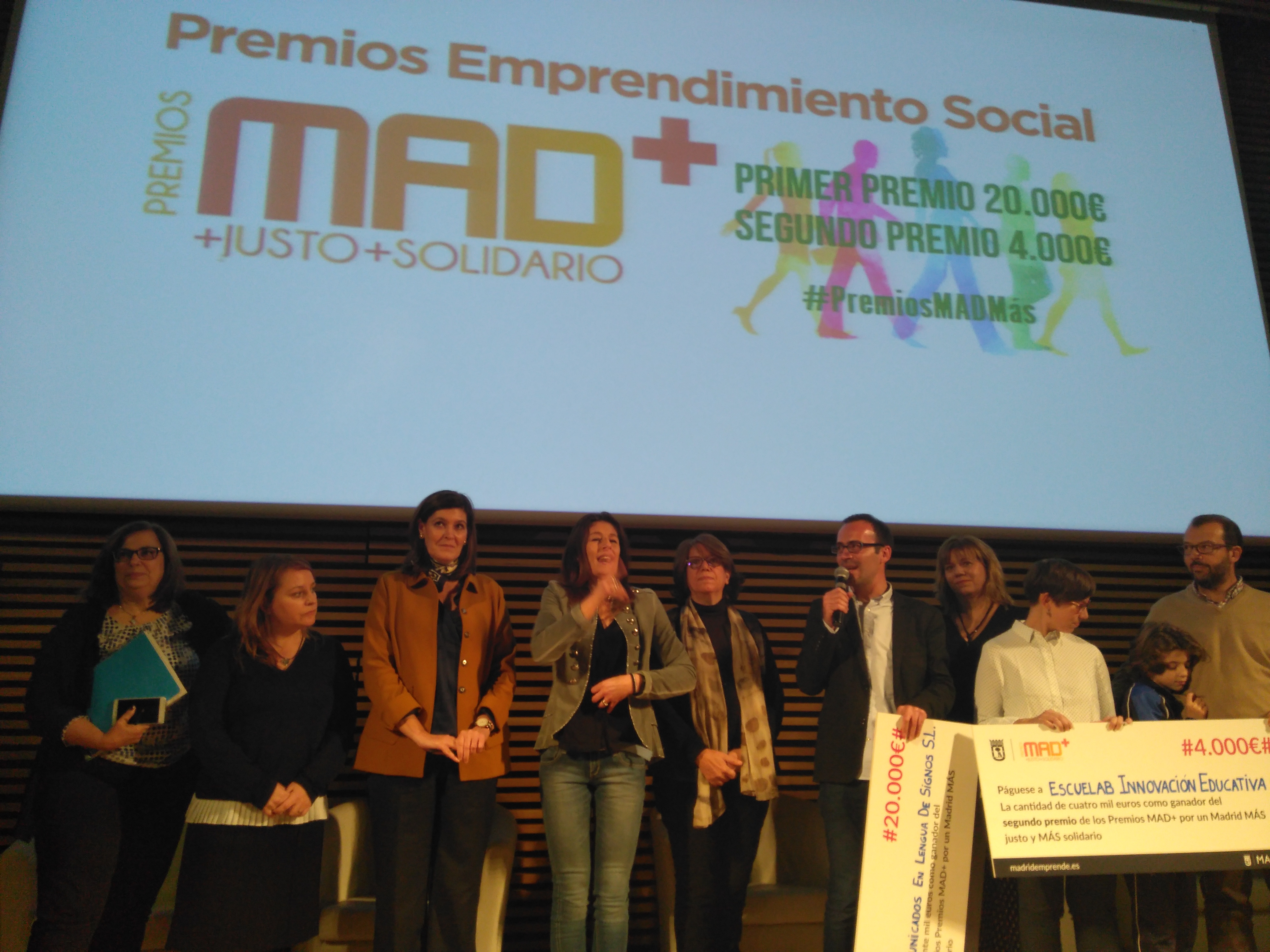 Comunicados en Lengua de Signos SL y Escuelalab Innovación Educativa han sido los ganadores del primer y segundo premio, respectivamente, de la primera edición de los Premios MAD+ 2017, “por un MADrid Más justo y Más solidario”, creados por la Dirección de Comercio y Emprendimiento, del Área de Equidad, Derechos Sociales y Empleo, para apoyar el emprendimiento social y que se entregaron anoche en el Centro Conde Duque.