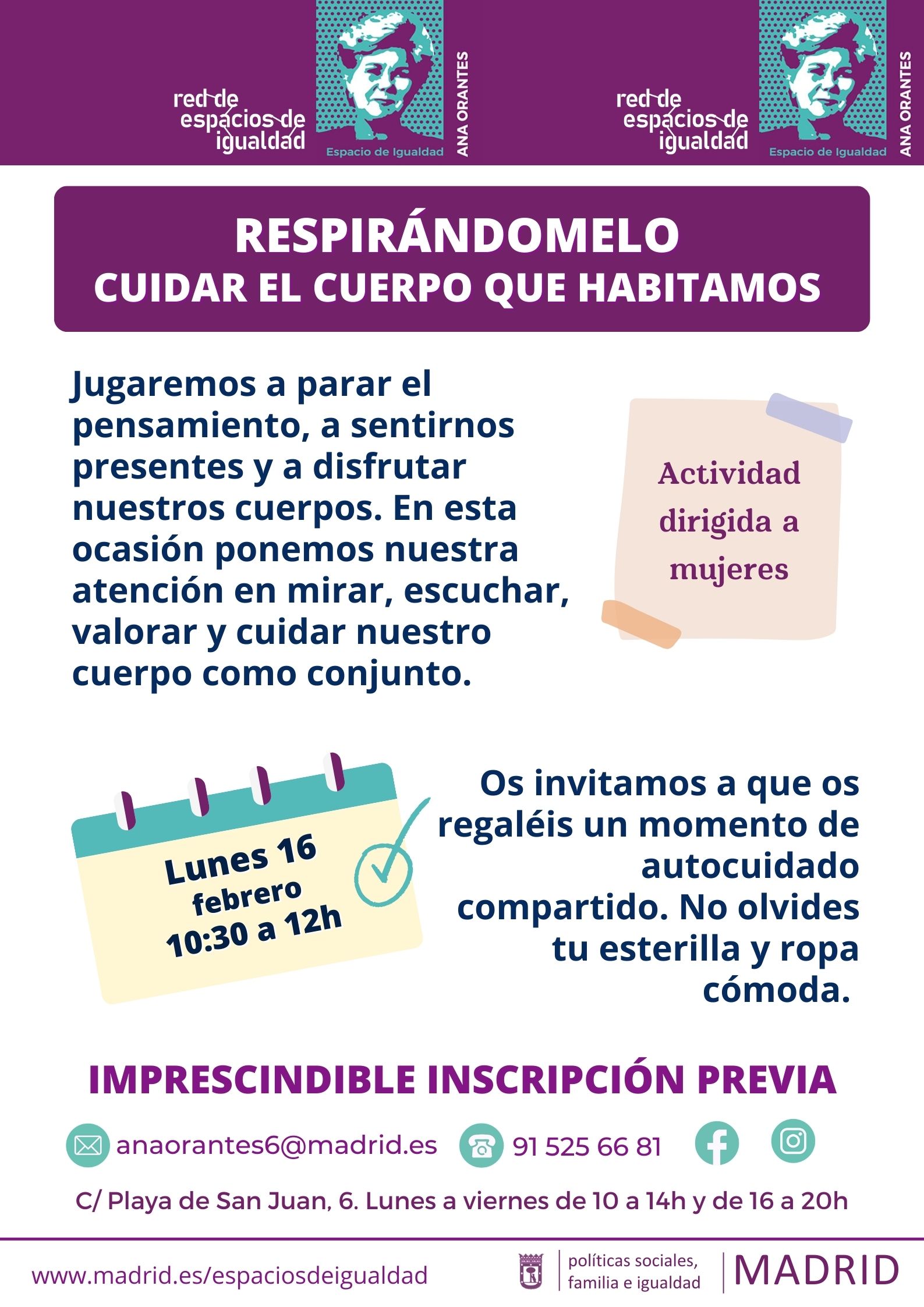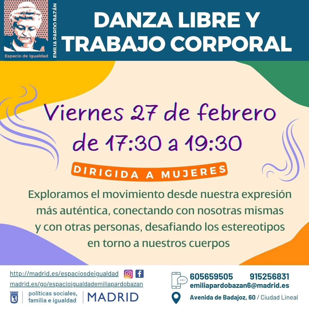 En la programación mensual de los Espacios de Igualdad se ofrecen de forma permanente actividades grupales de empoderamiento a través de la conciencia corporal, encaminadas a entender la necesidad del autocuidado y la forma de ejercerlo. Entre las propuestas puedes encontrar distintas actividades relacionadas con el movimiento corporal: biodanza, danza, estiramientos, pilates, yoga...