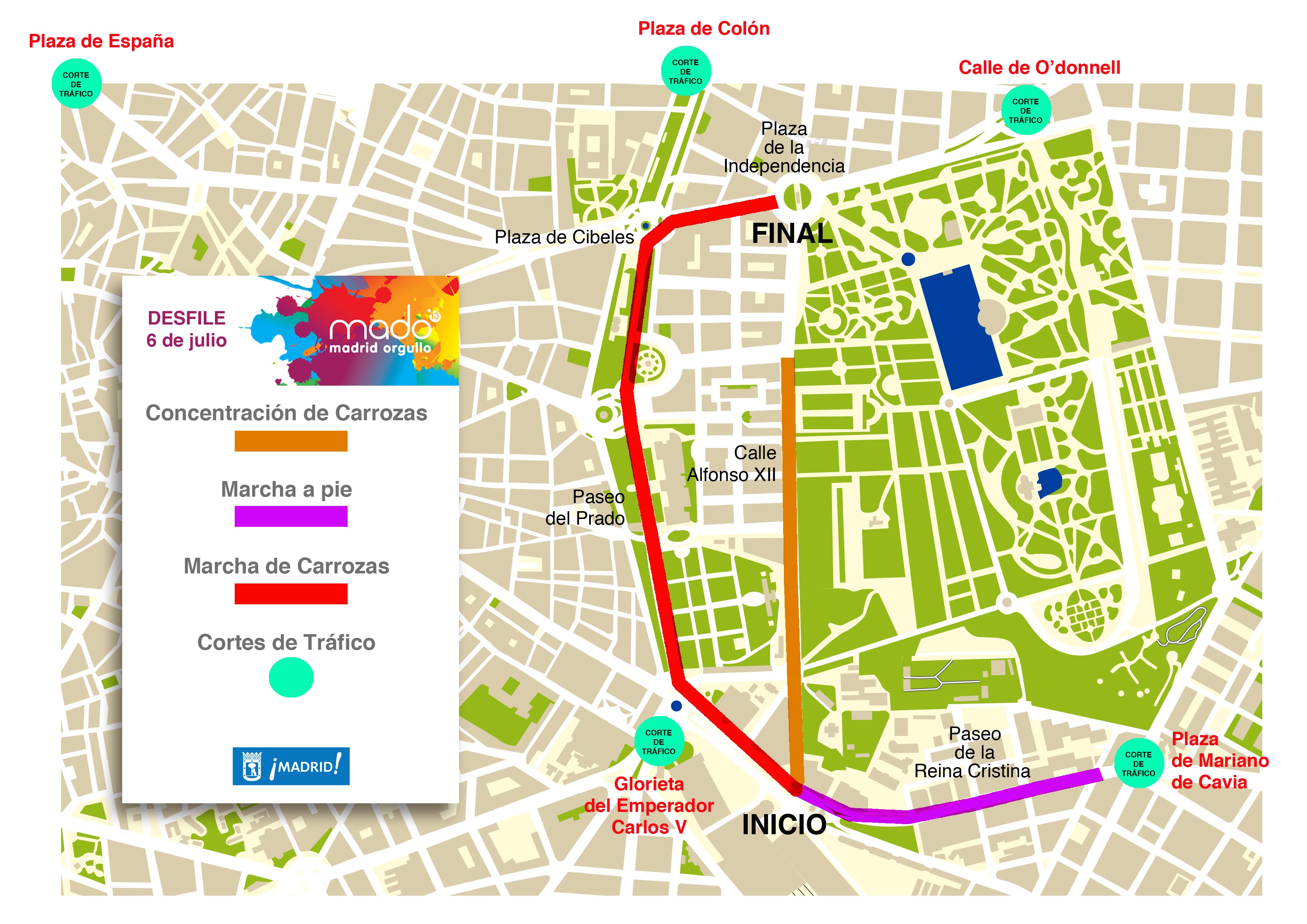 - Calle Alfonso XII, (acera más próxima a la tapia del Parque del Retiro) para que, a partir de las 11.00 horas del día 6 de julio, aparquen las carrozas.