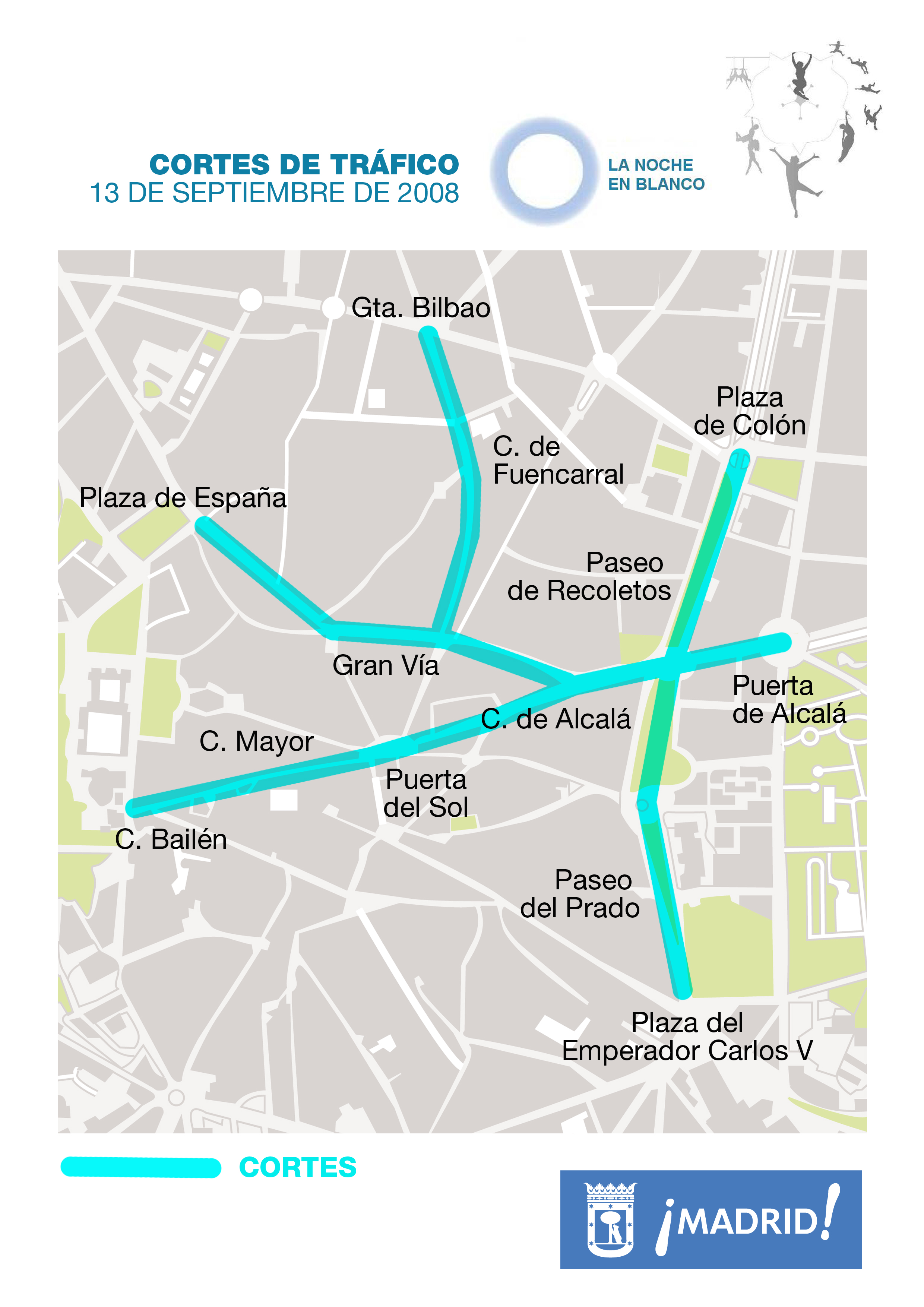 Con motivo de la celebración de La noche en blanco, el próximo día 13 de septiembre, el Ayuntamiento de Madrid ha elaborado un plan de movilidad que incluye cortes y desvíos de tráfico en varias vías principales de la ciudad entre las 20.30 horas del próximo sábado 13 de septiembre y las 7.00 horas del domingo. El operativo cuenta con 300 policías municipales y 20 agentes de movilidad. Por este motivo, el Ayuntamiento recomienda a los ciudadanos que utilicen el transporte público.