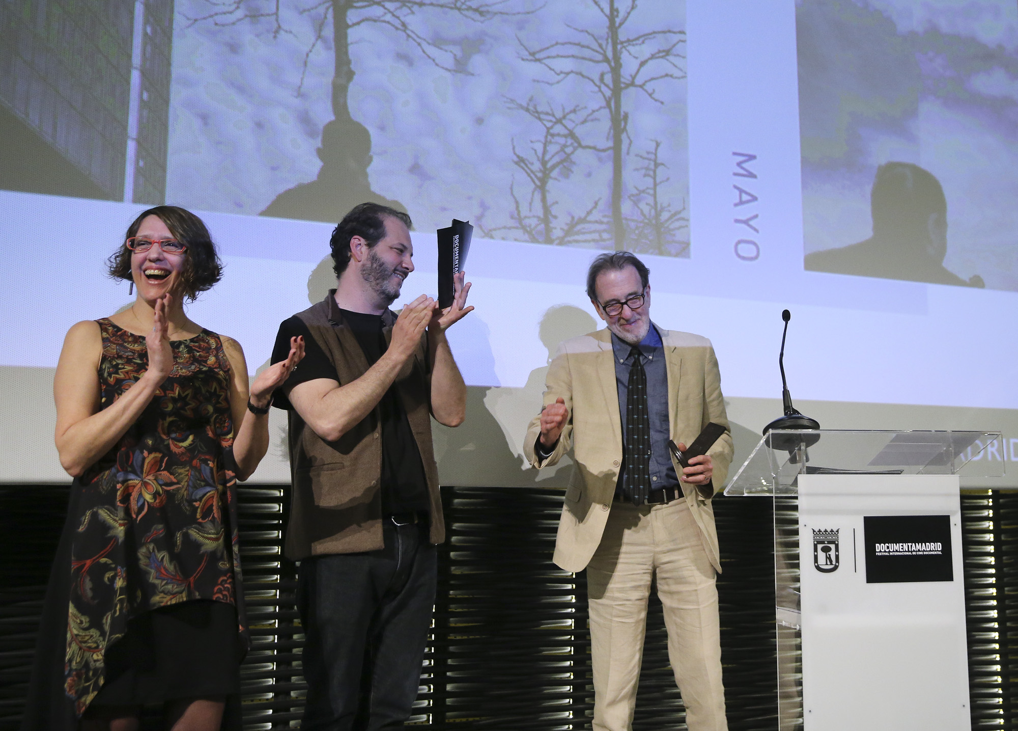 Andrea Guzmán y David Varela, codirectores artísticos del festival de cine documental del Ayuntamiento de Madrid, dieron la bienvenida a los asistentes a la decimoquinta edición, acompañados por Luis Cueto, coordinador general de la Alcaldía, con un llamamiento a disfrutar y compartir las decenas de películas que pasarán por las múltiples pantallas del festival. “Es posible que todas las historias hayan sido contadas alguna vez. Lo bonito es tener la oportunidad de disfrutar y de programar —que no es otra cosa que compartir— las diversas formas de contarlas que pueden existir”, explicaba Andrea Guzmán ante una sala abarrotada de cineastas y distintas personalidades de la política madrileña y la cultura.