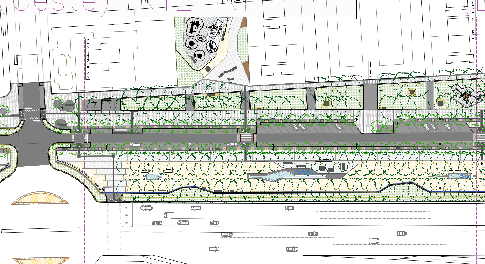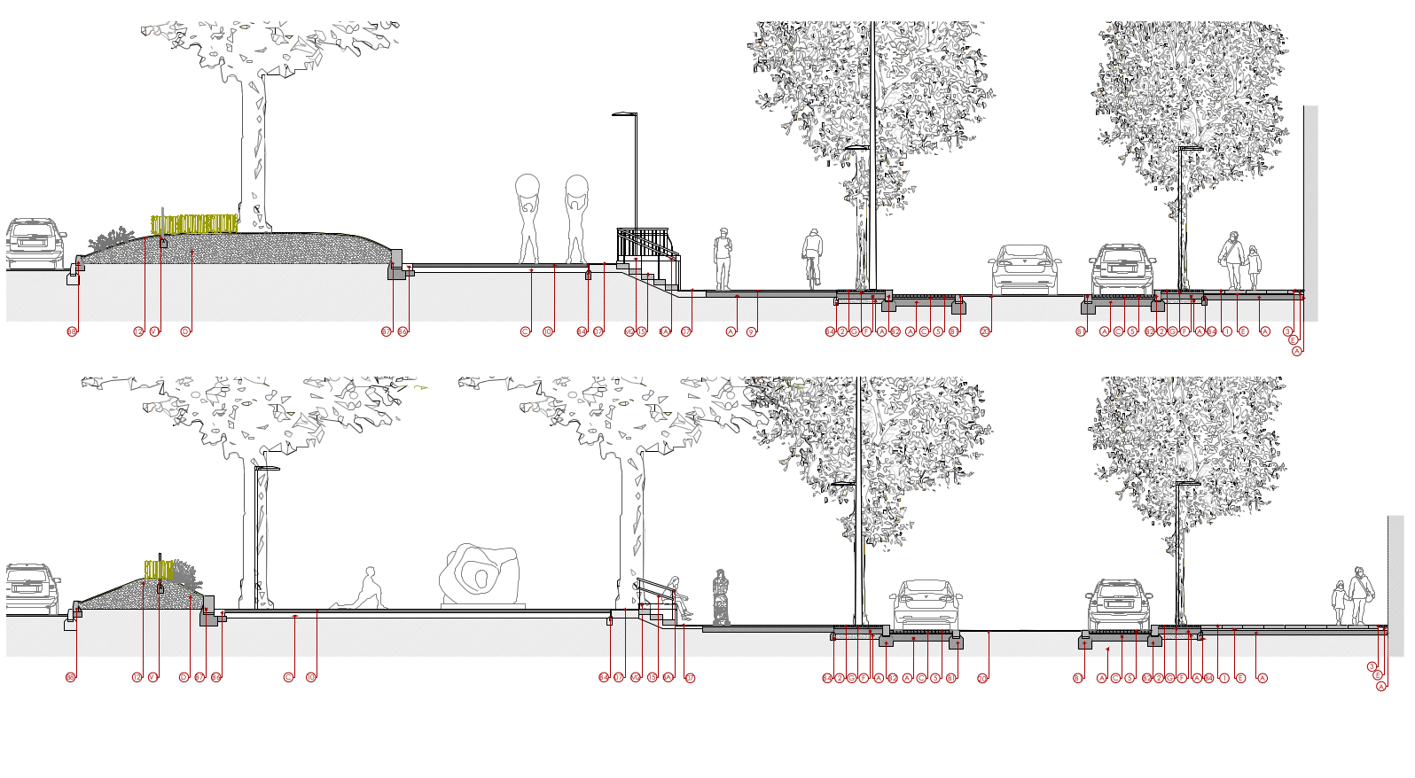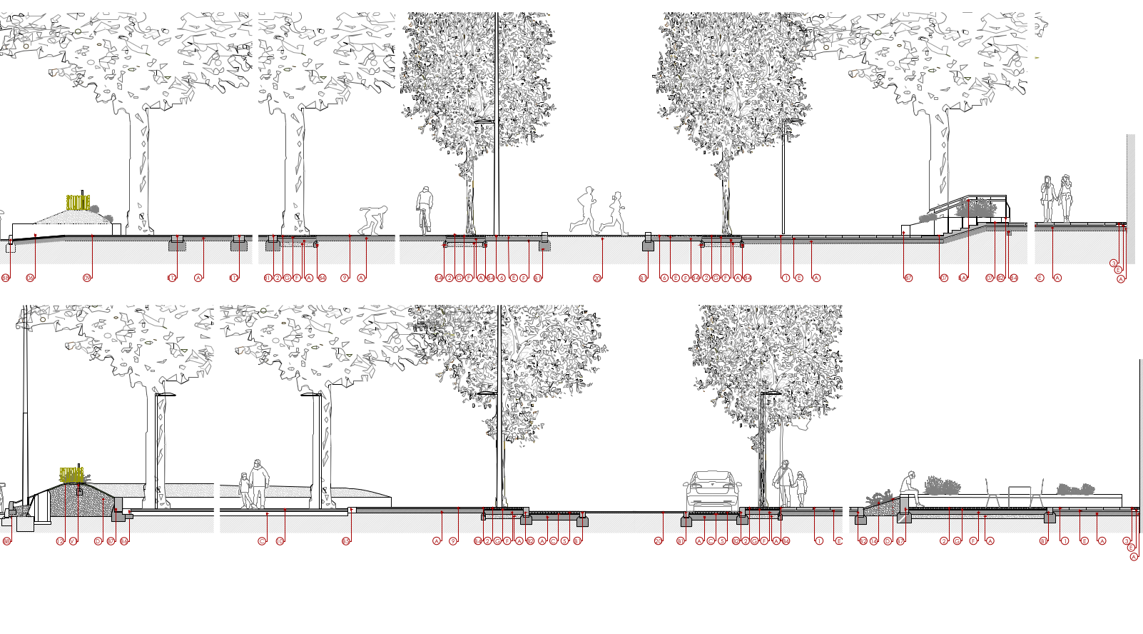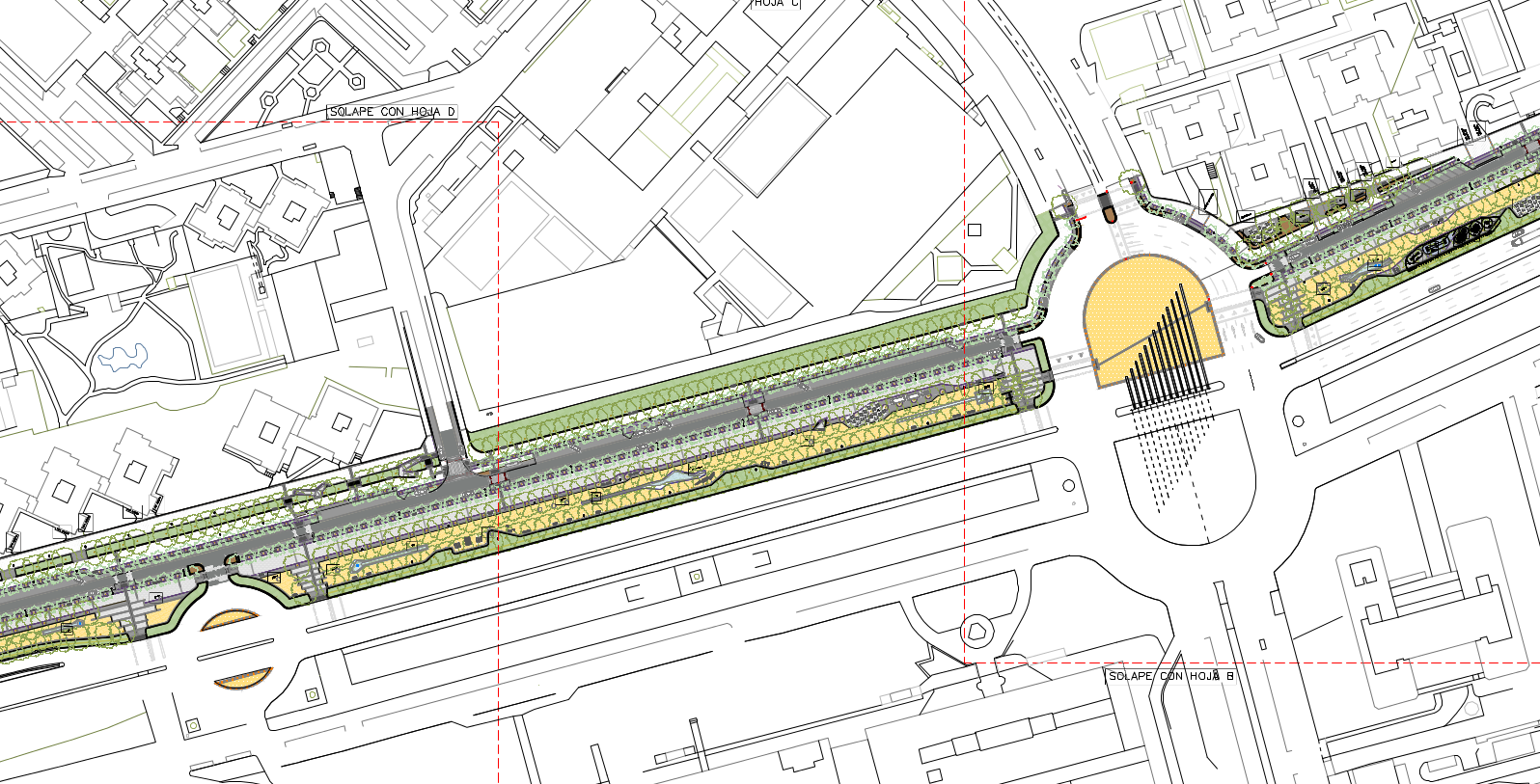 La gran bóveda de árboles, compuesta por una línea de plátanos a cada lado separadas por unos seis metros, delimitará la zona de paseo. Este recorrido se corresponde con el cauce de un arroyo que formaba parte de la antigua topografía y por ello se recuperará el agua como elemento de continuidad que acompañe al arbolado gracias a varias fuentes ornamentales.