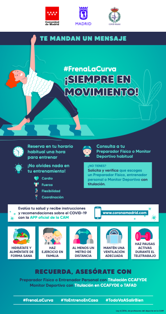 El Ayuntamiento de Madrid, a través del Área Delegada de Deporte, la Viceconsejería de Deportes de la Comunidad de Madrid y el Colegio Oficial de Licenciados en Ciencias de la Actividad Física y del Deporte de la Comunidad (COPLEF Madrid) se han unido para animar a evitar el sedentarismo y fomentar el ejercicio en casa mientras dure el confinamiento provocado por el estado de alarma. Lo hacen lanzando la campaña ‘¡Siempre en movimiento!’ para trasmitir un mensaje conjunto a la población madrileña con los siguientes objetivos: