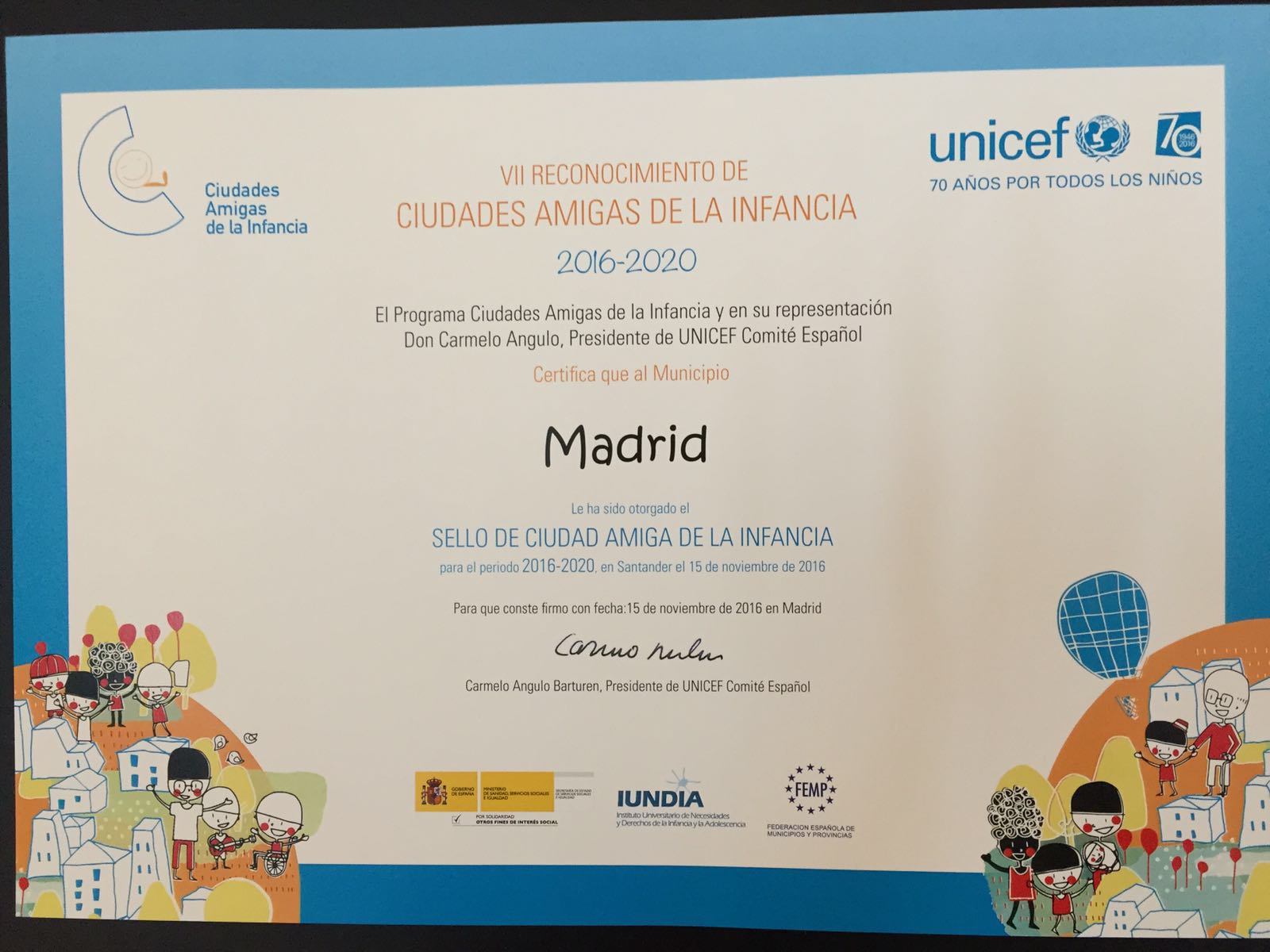 El Ayuntamiento de Madrid recoge el Sello de reconocimiento de Ciudades Amigas de la Infancia otorgado por UNICEF
