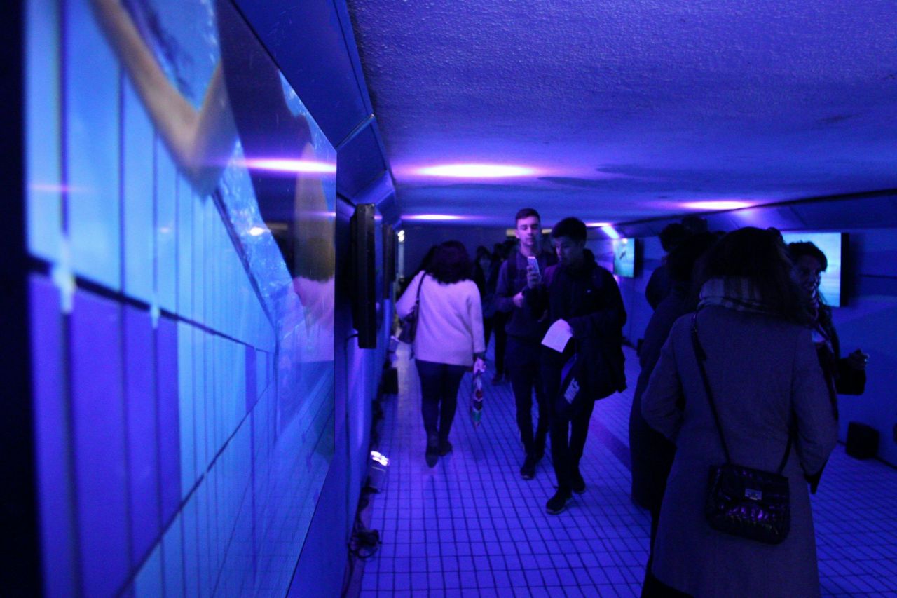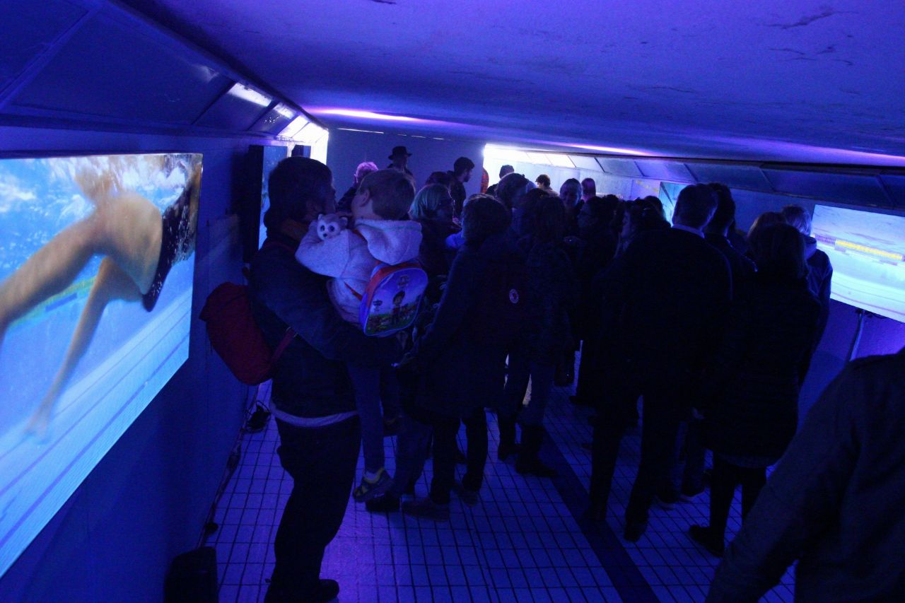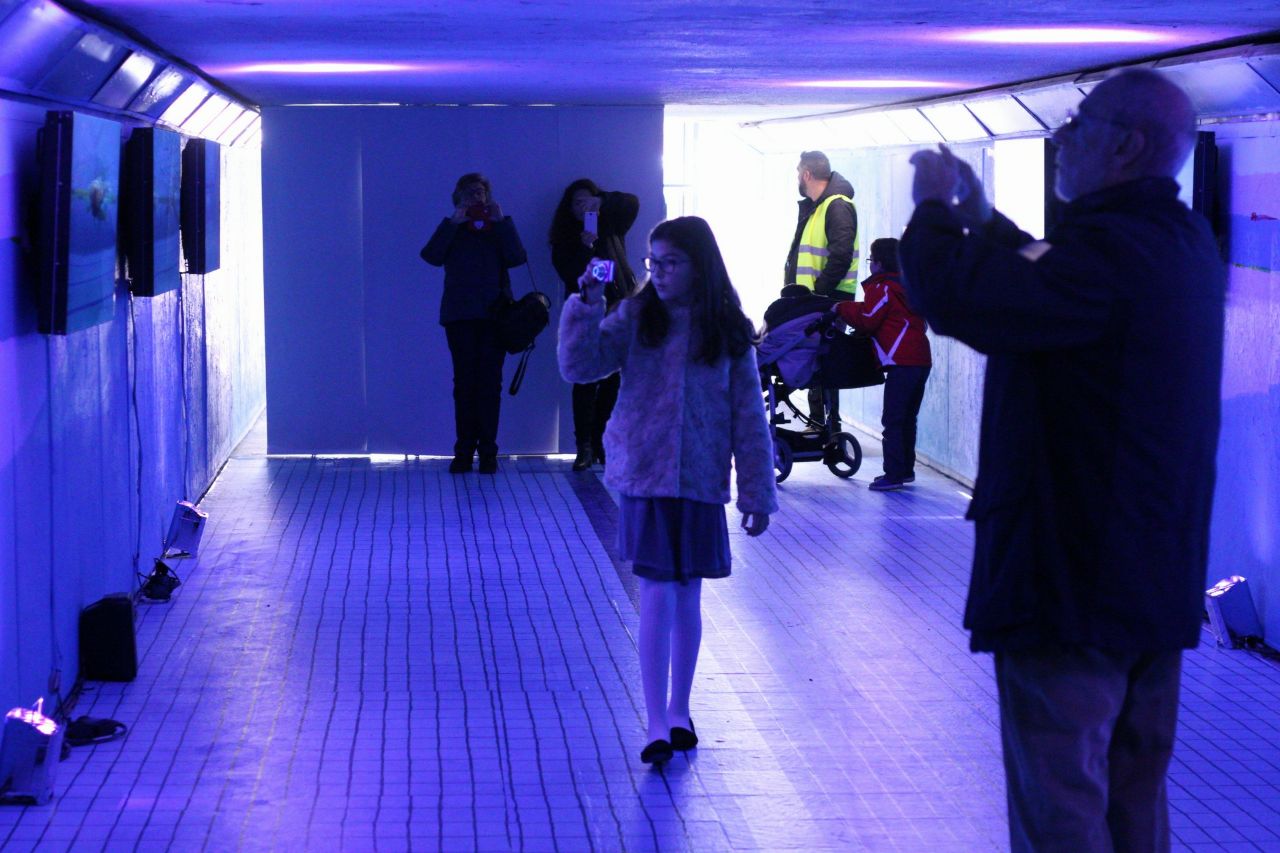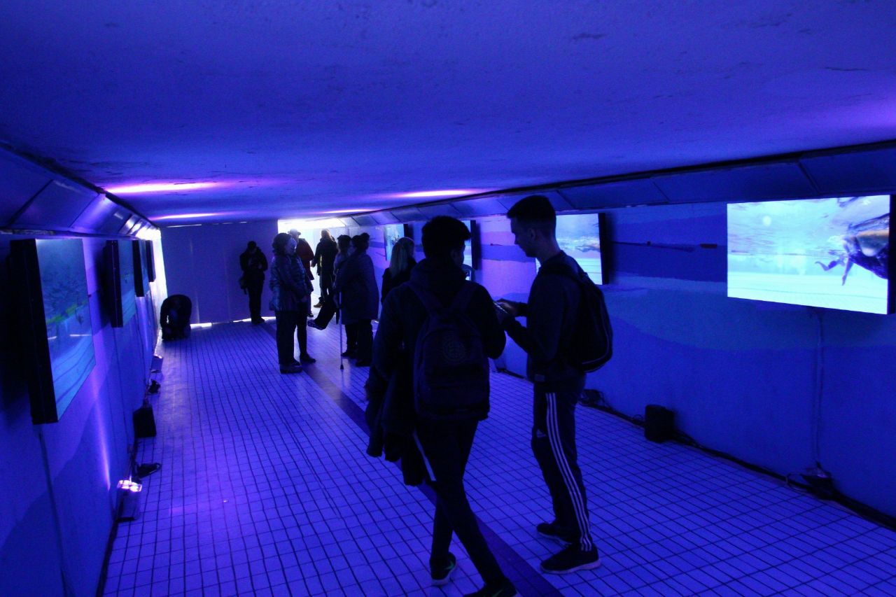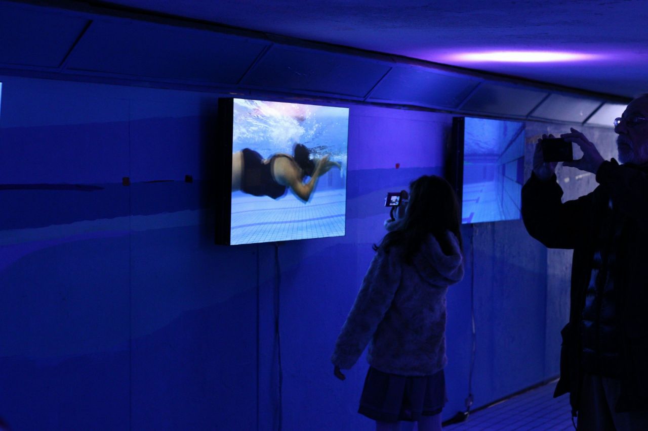 A lo largo de todo el día de hoy sábado, los transeúntes que crucen el túnel podrán disfrutar de un paseo a lo largo de una piscina en la que, según la autora, Trinidad Irisarri, “por unos minutos, nos acercamos a una realidad alternativa que permite la evasión del cuerpo y de la identidad, surgiendo un fluir espontáneo cargado de libertad, trasladando a quien camina por la instalación a un estado de bienestar”./