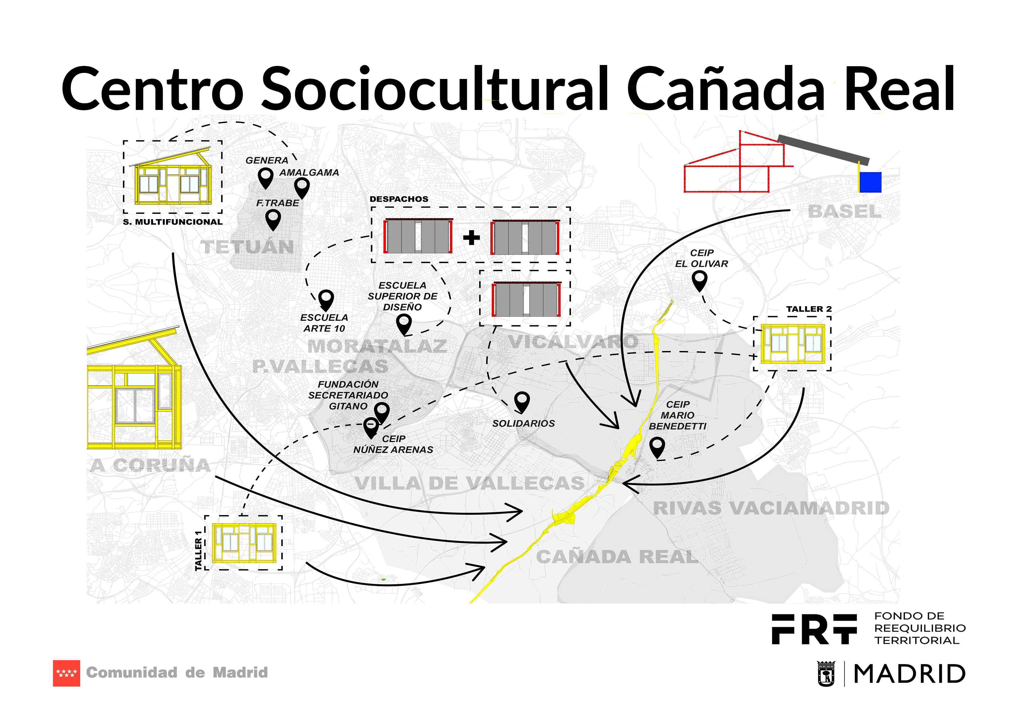 La Universidad de Alcalá, el IES Segovia, la Escuela de Arte 4, la Universidad Nacional de Uruguay, los CEIP Mario Benedetti (Rivas-Vaciamadrid) y Núñez de Arenas (Puente de VallecasI), los centros penitenciarios de Valdemoro y Soto, y entidades como Cáritas, Asociación Barró, Fundación Secretariado Gitano, Accem y Cruz Roja colaborarán en la construcción del centro. /