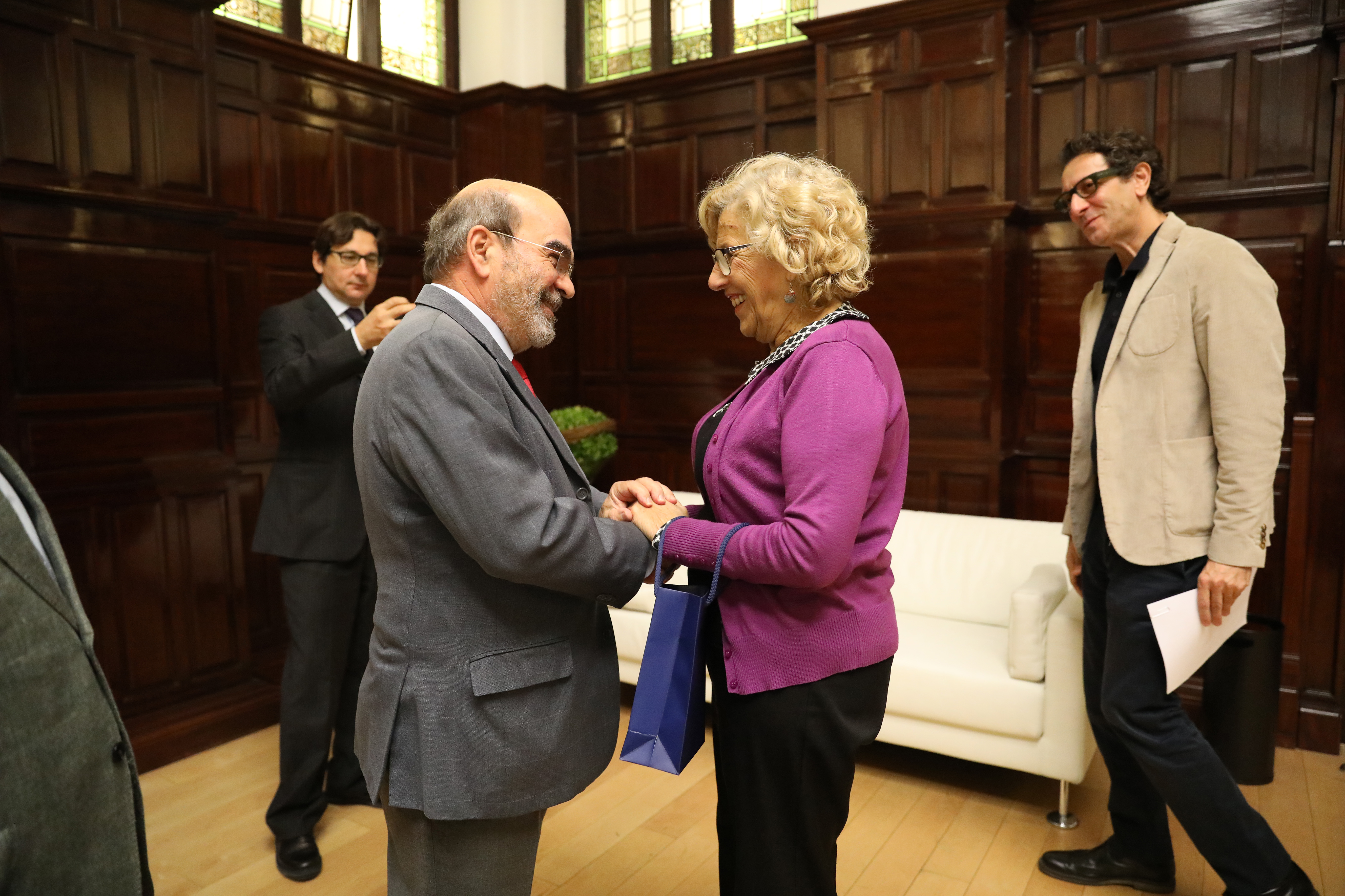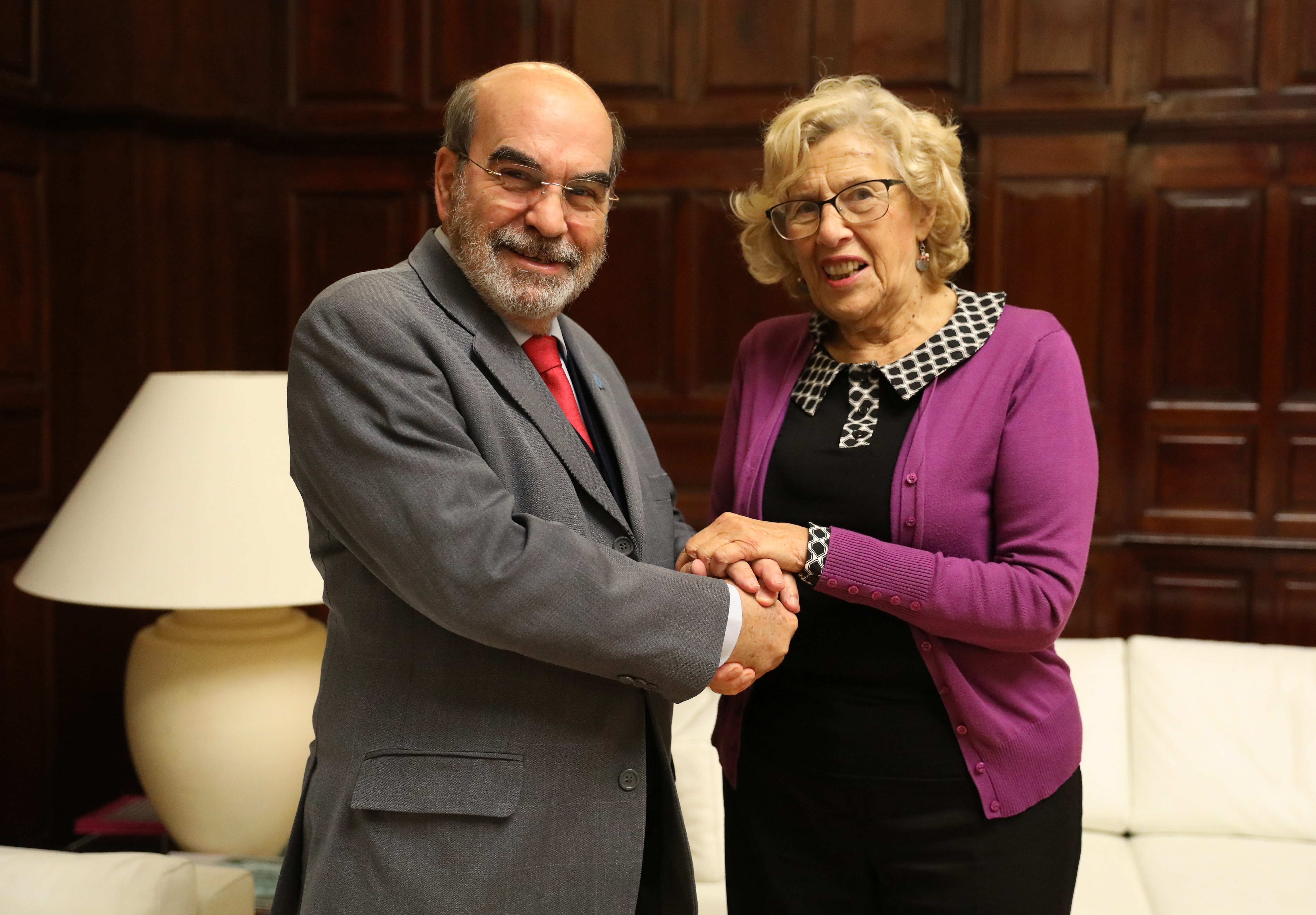 La alcaldesa de Madrid, Manuela Carmena, se ha entrevistado hoy en el palacio de Cibeles con José Graziano da Silva, director general de la Organización de las Naciones Unidas para la Alimentación y la Agricultura (FAO), con quien ha abordado los detalles de la próxima firma de un memorando de entendimiento entre la FAO y el Ayuntamiento de Madrid. El objetivo es mejorar la alimentación saludable, la nutrición, la producción sostenible y la distribución justa entre la ciudadanía madrileña.