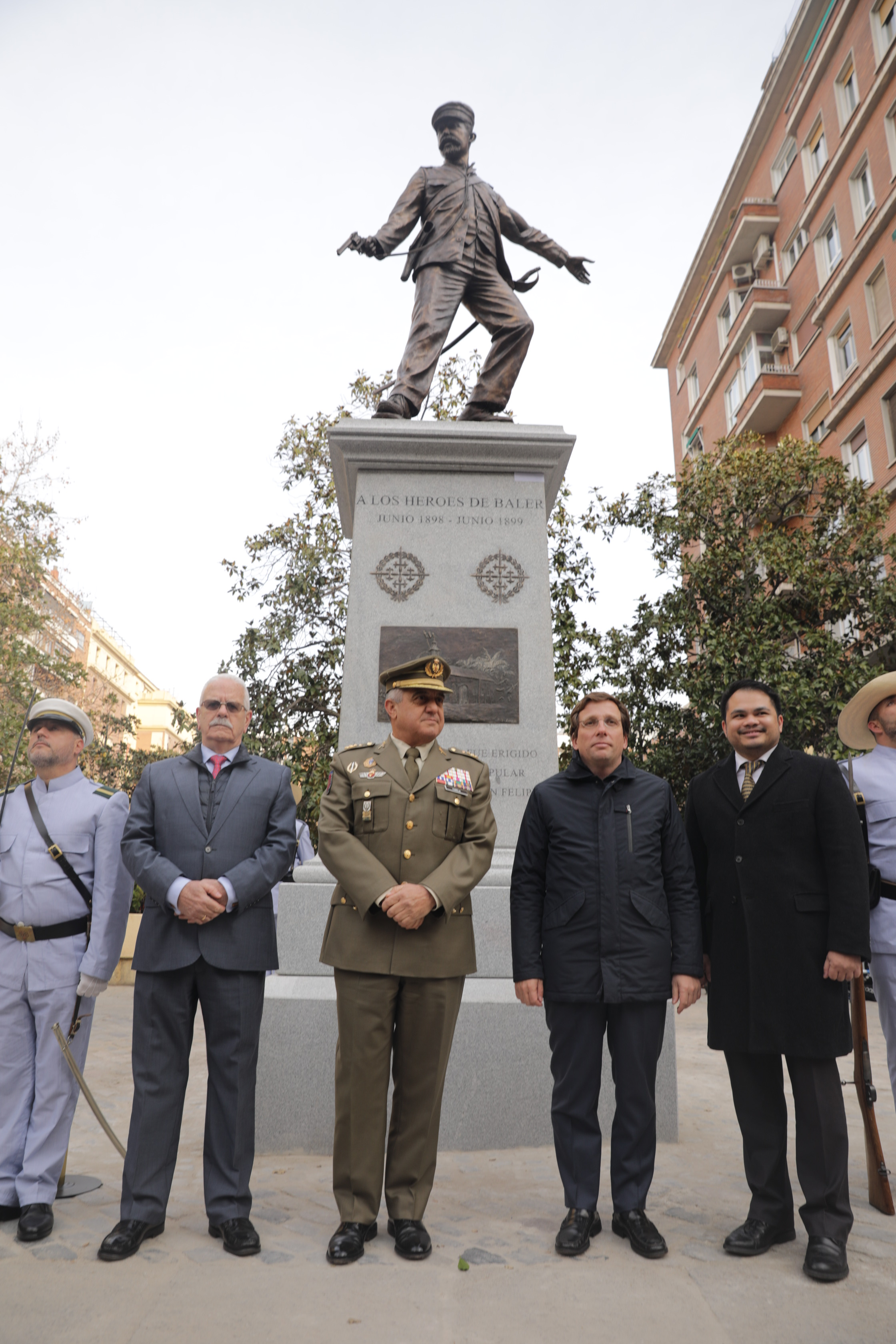 El alcalde de Madrid, José Luis Martínez-Almeida, acompañado del jefe de Estado Mayor del Ejército, Francisco Javier Varela; el vicecónsul de la embajada de Filipinas en Madrid, Ralf Roldán; y la delegada de Cultura, Turismo y Deporte, Andrea Levy; además de portavoces y concejales del Ayuntamiento, ha inaugurado este lunes un monumento en honor a los héroes de Baler, creado por el escultor Salvador Amaya con motivo del 120º aniversario de su gesta.