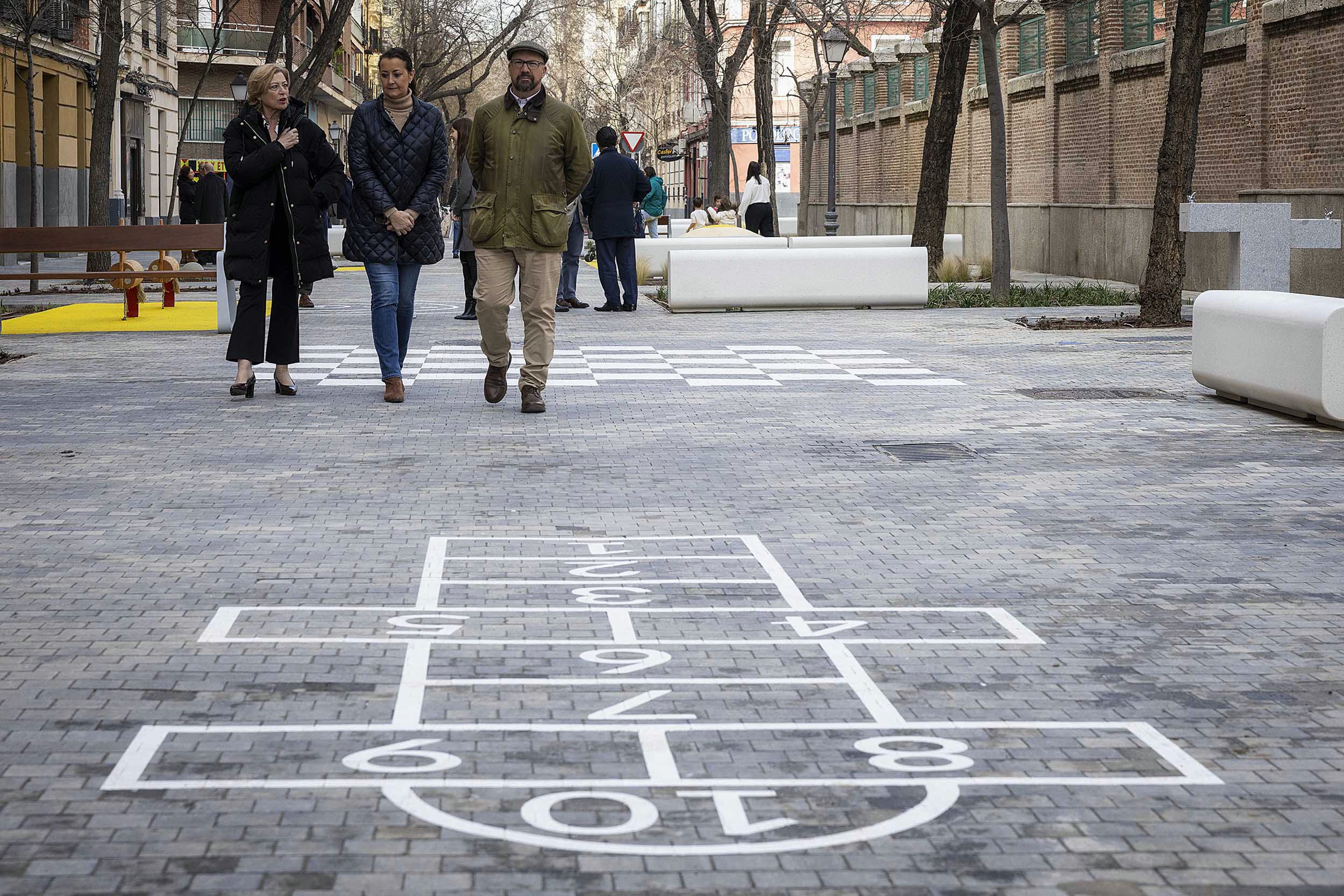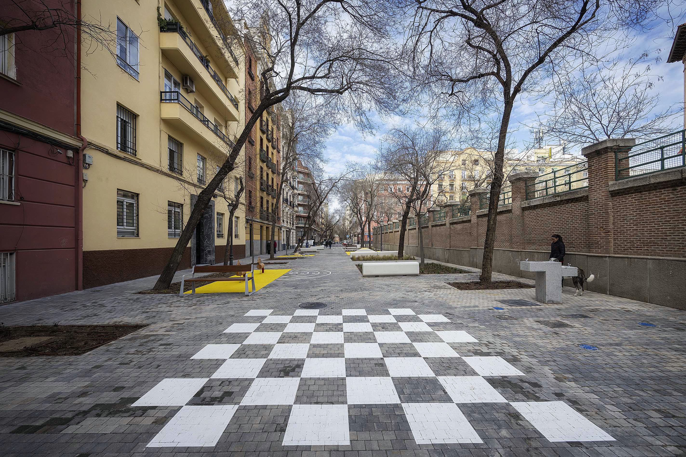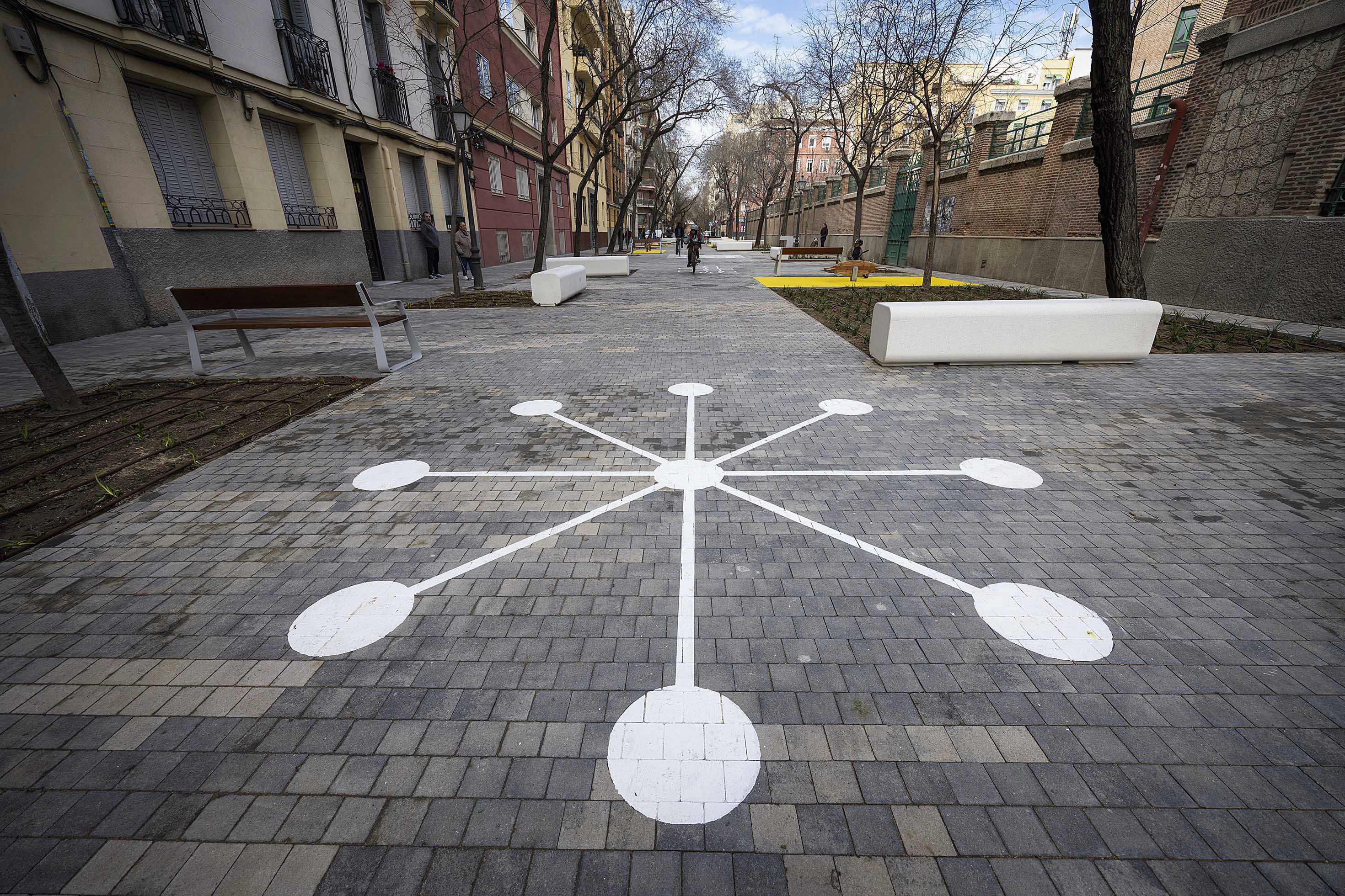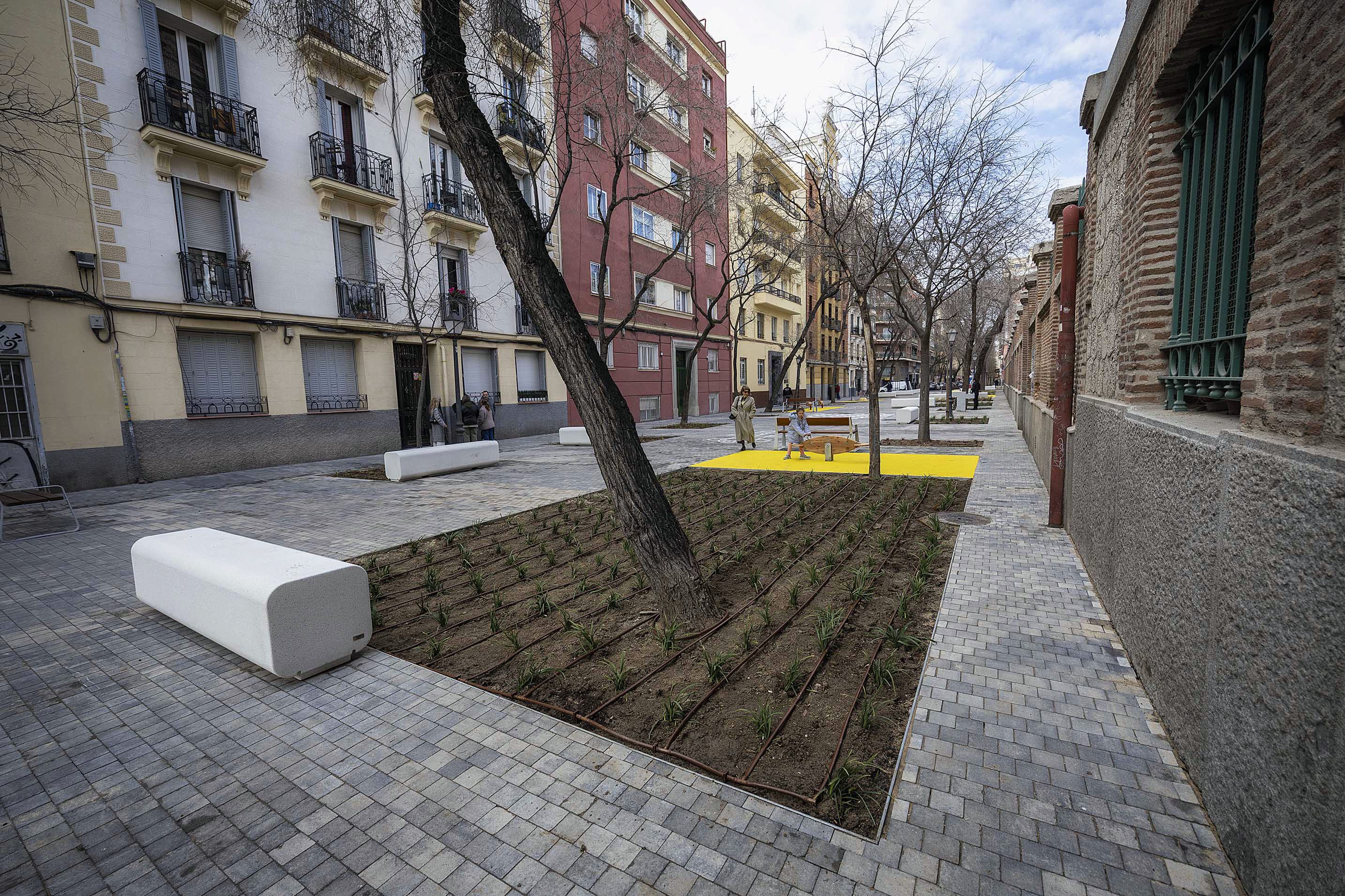 Los trabajos han incluido la peatonalización de la calle Murcia entre las calles Rafael de Riego y Méndez Álvaro para que funcione como extensión del patio escolar. En este sentido, se ha dotado a la vía de un paseo central con dos grandes alineaciones de parterres en las que se intercalan espacios estanciales y zonas de juegos. Asimismo, se mantiene un recorrido continuo y accesible a lo largo de la fachada residencial que permite un acceso directo a los locales y portales existentes. La disposición de los elementos deja un espacio central libre de interferencias para el acceso de vehículos en caso de emergencia.