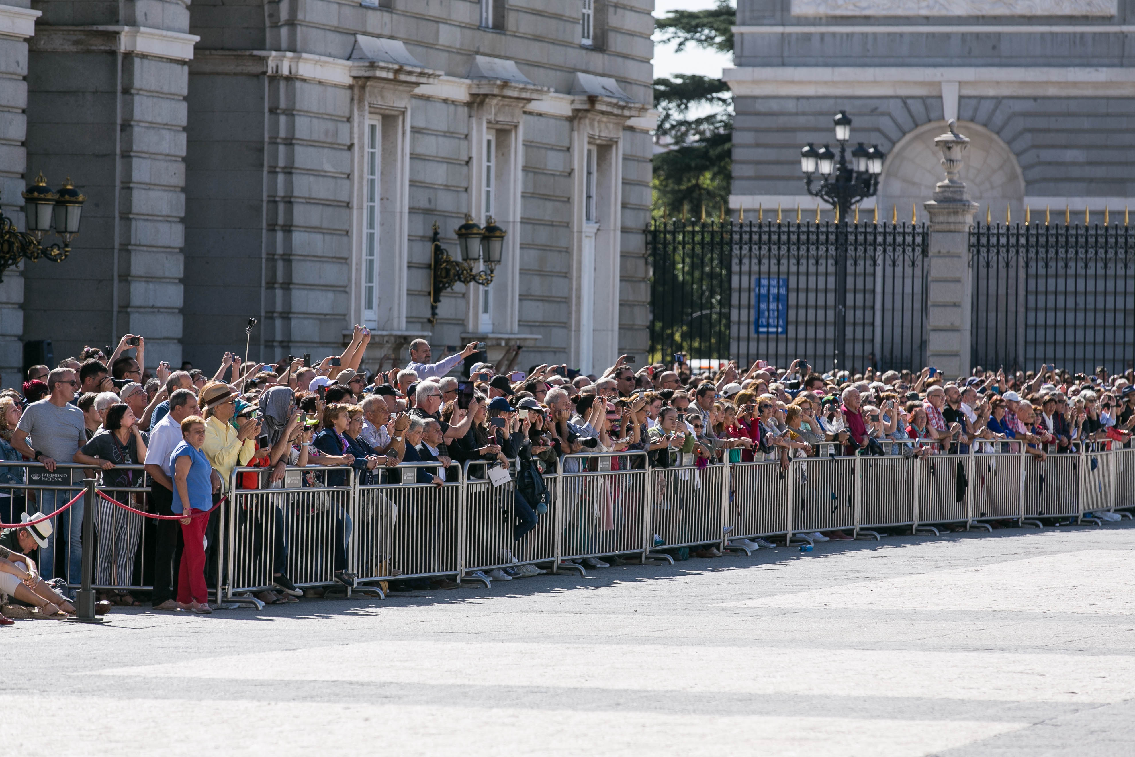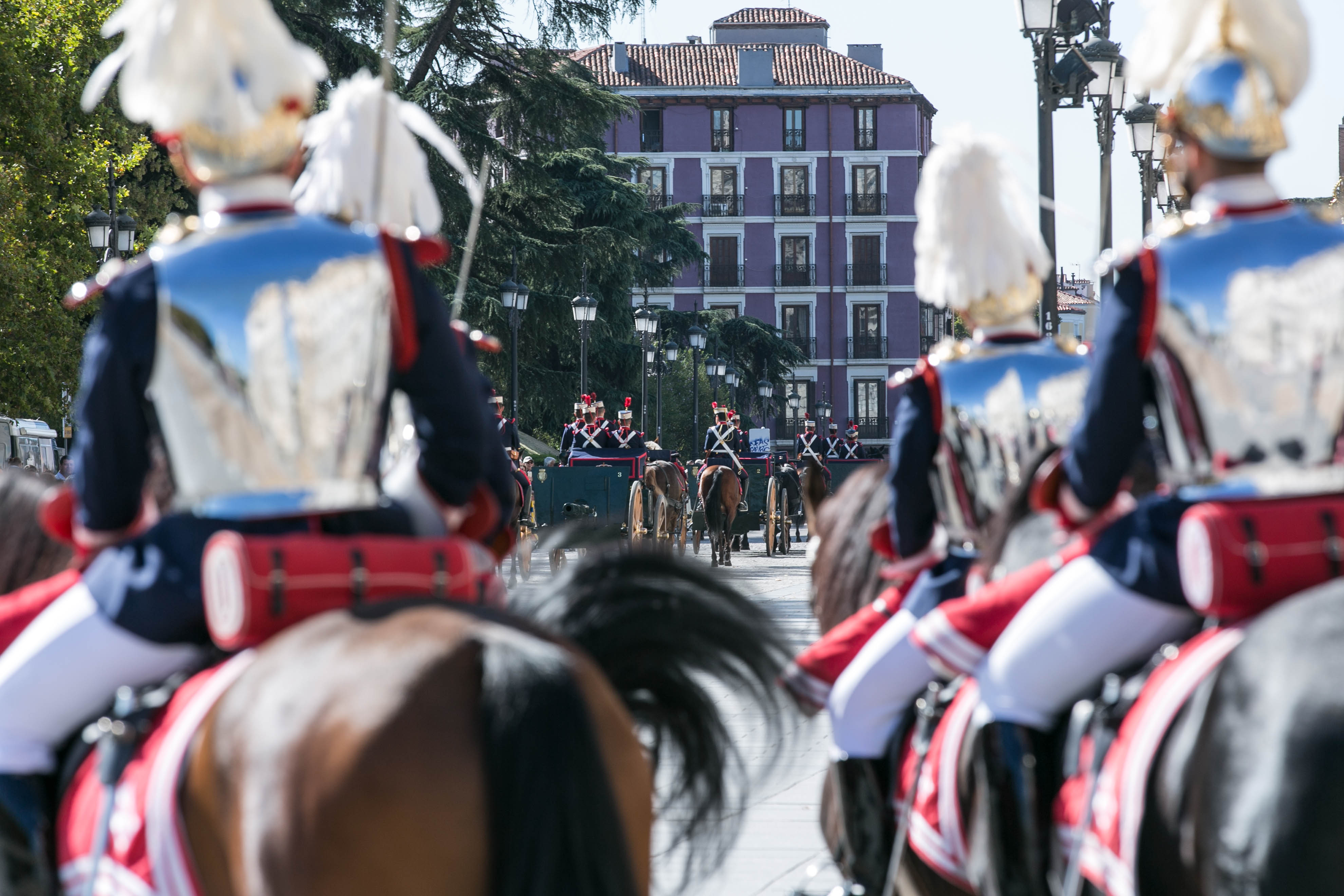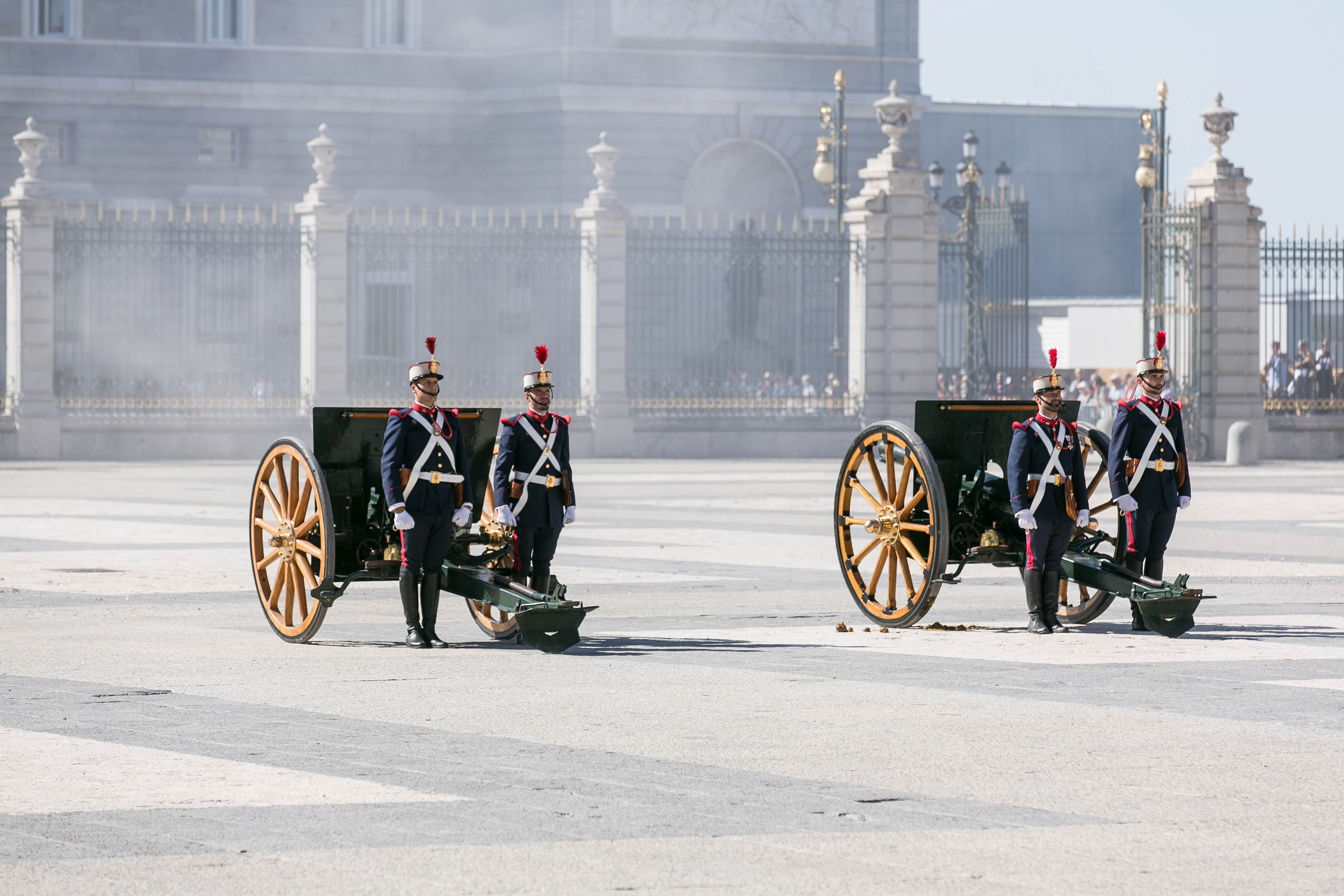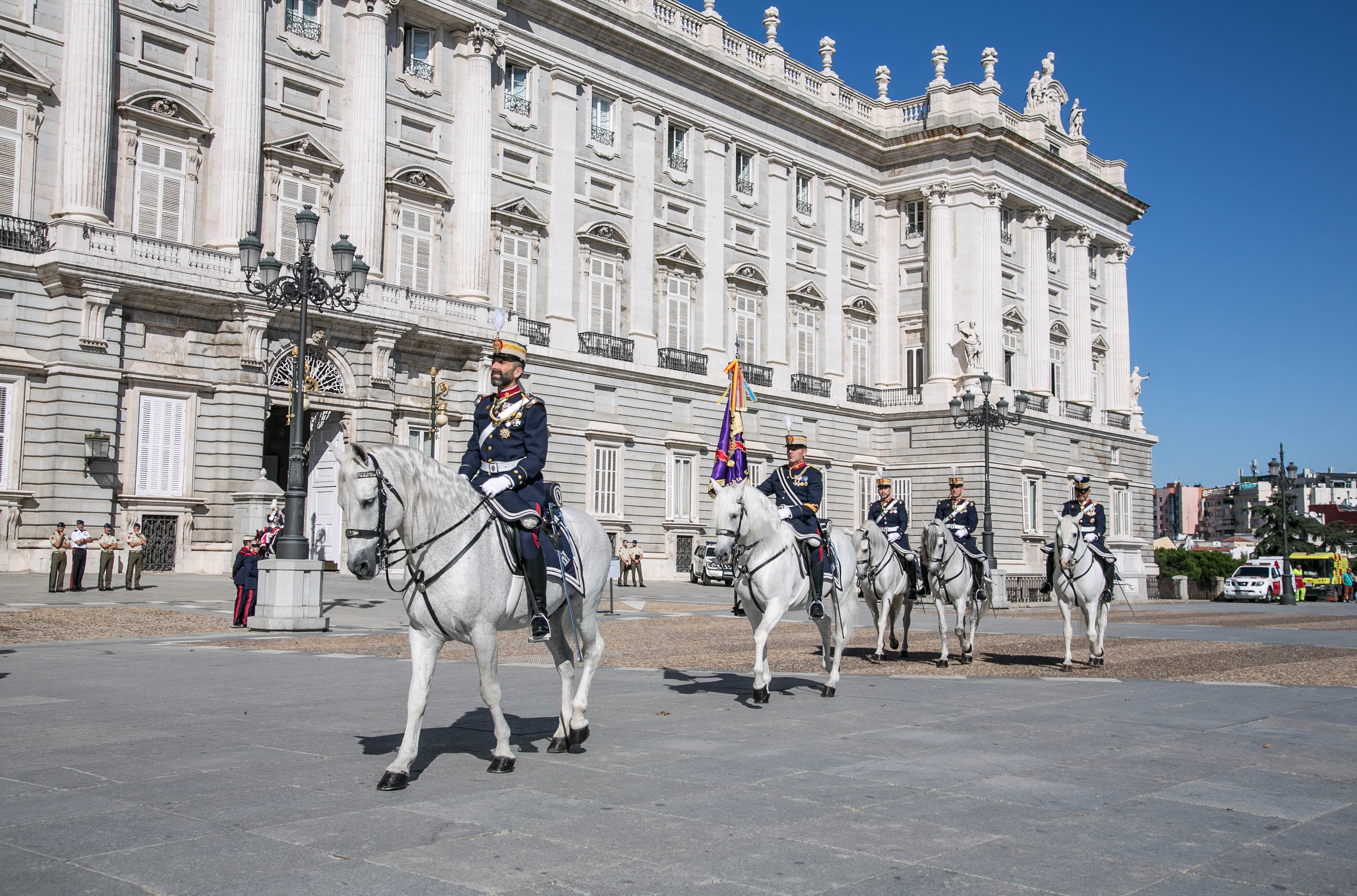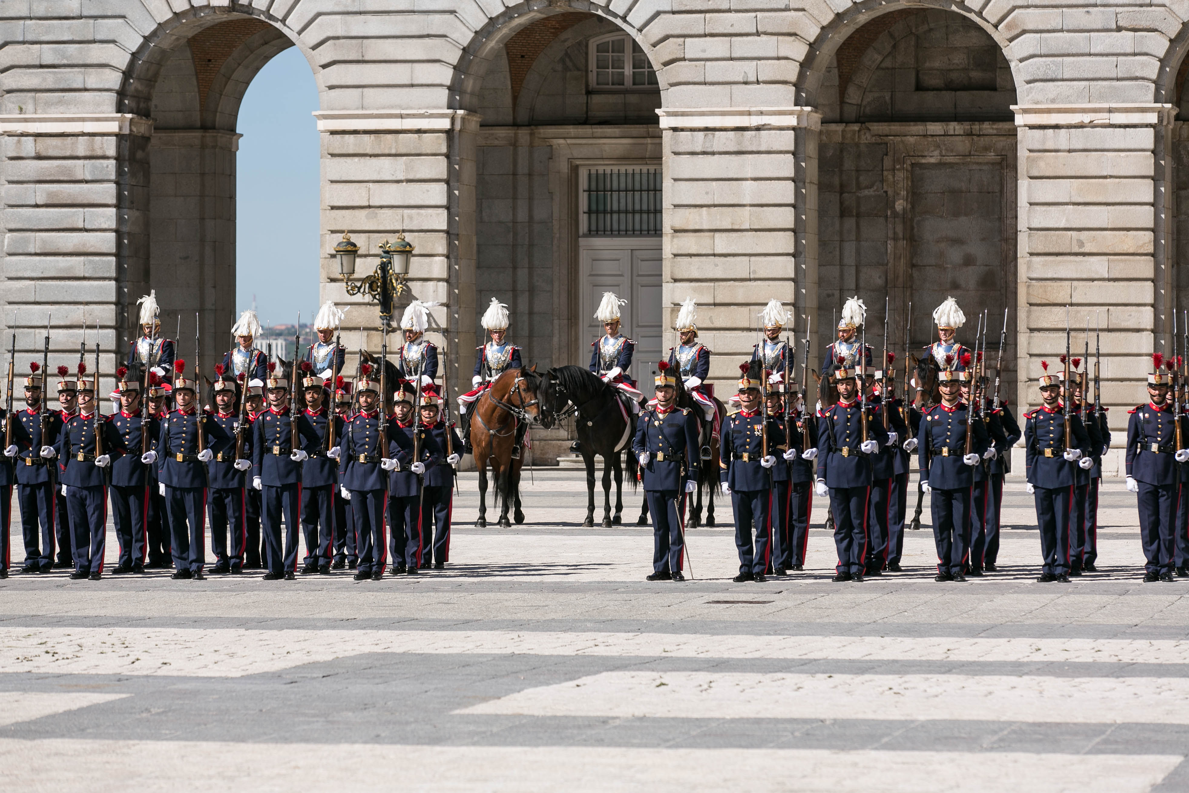 El relevo solemne de la Guardia Real se inicia con el establecimiento de los puestos de guardia en la Plaza de la Armería y continúa con una serie de actos que permiten contemplar durante 50 minutos el desfile de lanceros y alabarderos, compañías de fusiles, militares a cargo de piezas de artillería y carrillos de munición.