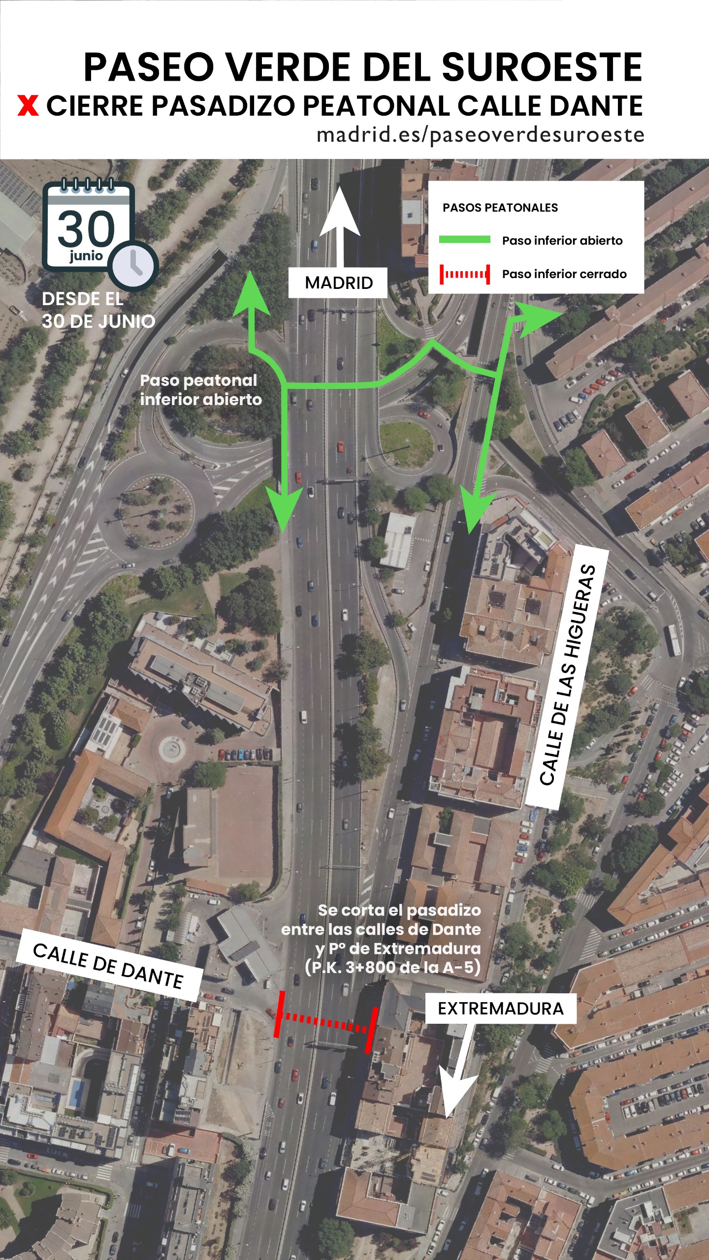 El próximo lunes, el Área de Urbanismo, Medio Ambiente y Movilidad, que dirige Borja Carabante, procederá a cerrar el último de los seis pasos exclusivamente peatonales que había en el tramo donde se está ejecutando el soterramiento. Se trata del pasadizo de Dante, ubicado entre las calles de Dante y el paseo de Extremadura (P.K. 3+800 de la A-5). Su clausura es necesaria para poder continuar con la ejecución de los pilotes -ya se ha construido el 58 % del total (4.078 de 7.000)- y las losas que conformarán el futuro túnel.