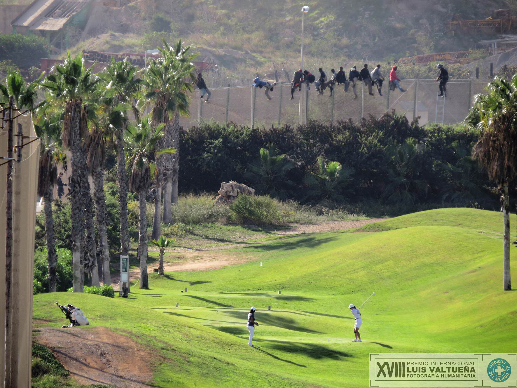 José Palazón, con “Paisajes de desolación”, es el ganador de esta edición. Su fotografía se tomó el pasado 22 de octubre en Melilla y en ella aparece un grupo de inmigrantes subsaharianos subidos a la valla junto a un campo de golf en el que dos jugadoras continúan con su partido indiferentes a lo que está ocurriendo. Palazón vive en Melilla y es fundador de la Asociación Pro Derechos de la Infancia (PRODEIN). Ha recibido varios premios por su actividad en la defensa de los derechos humanos en la frontera de España con Marruecos, entre ellos el Premio Periodismo Humano en 2013.