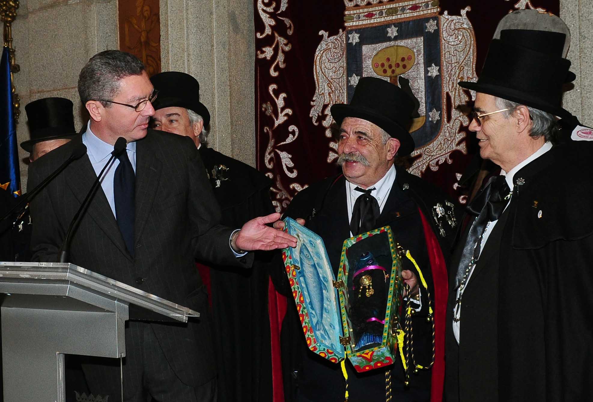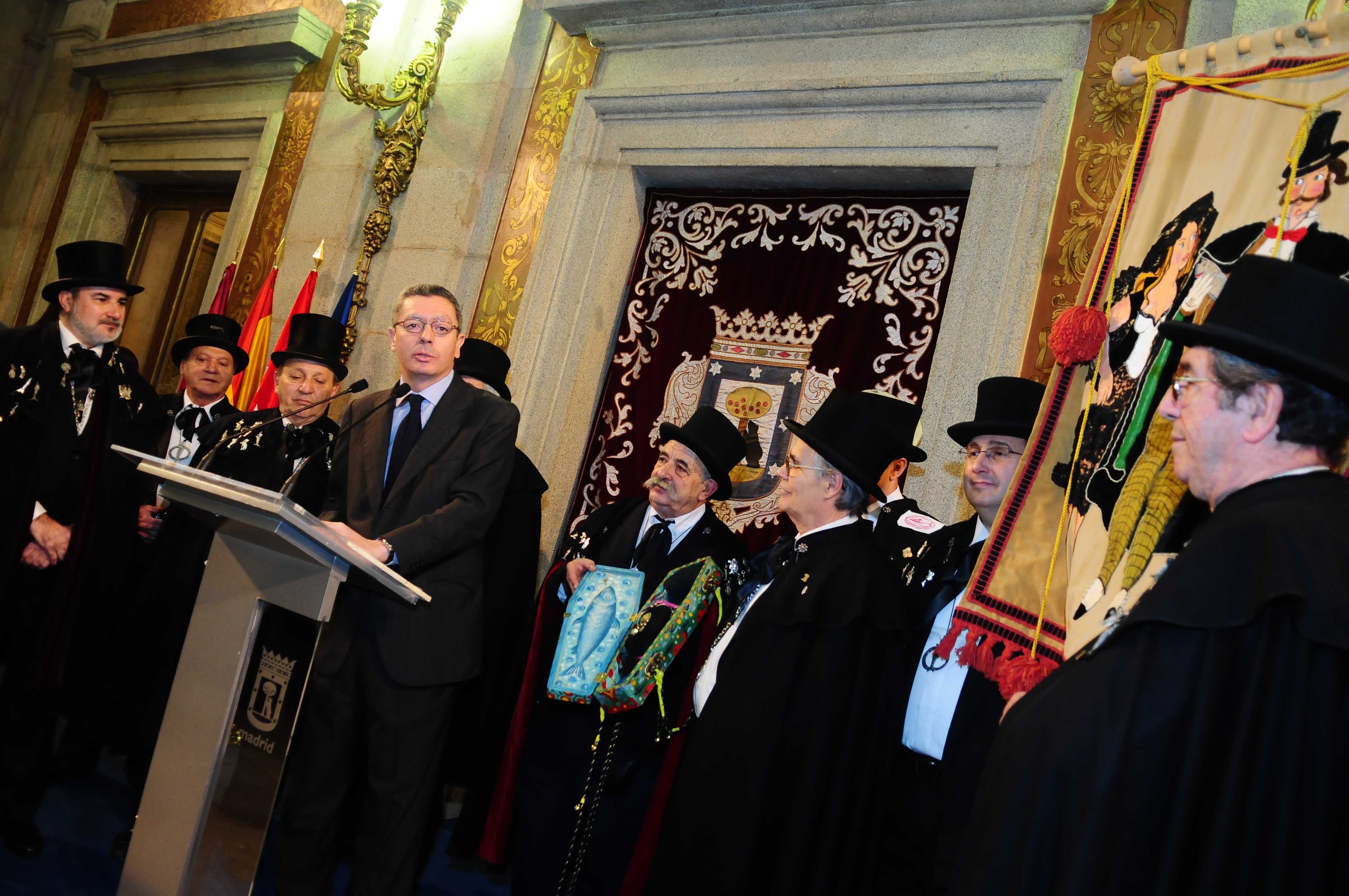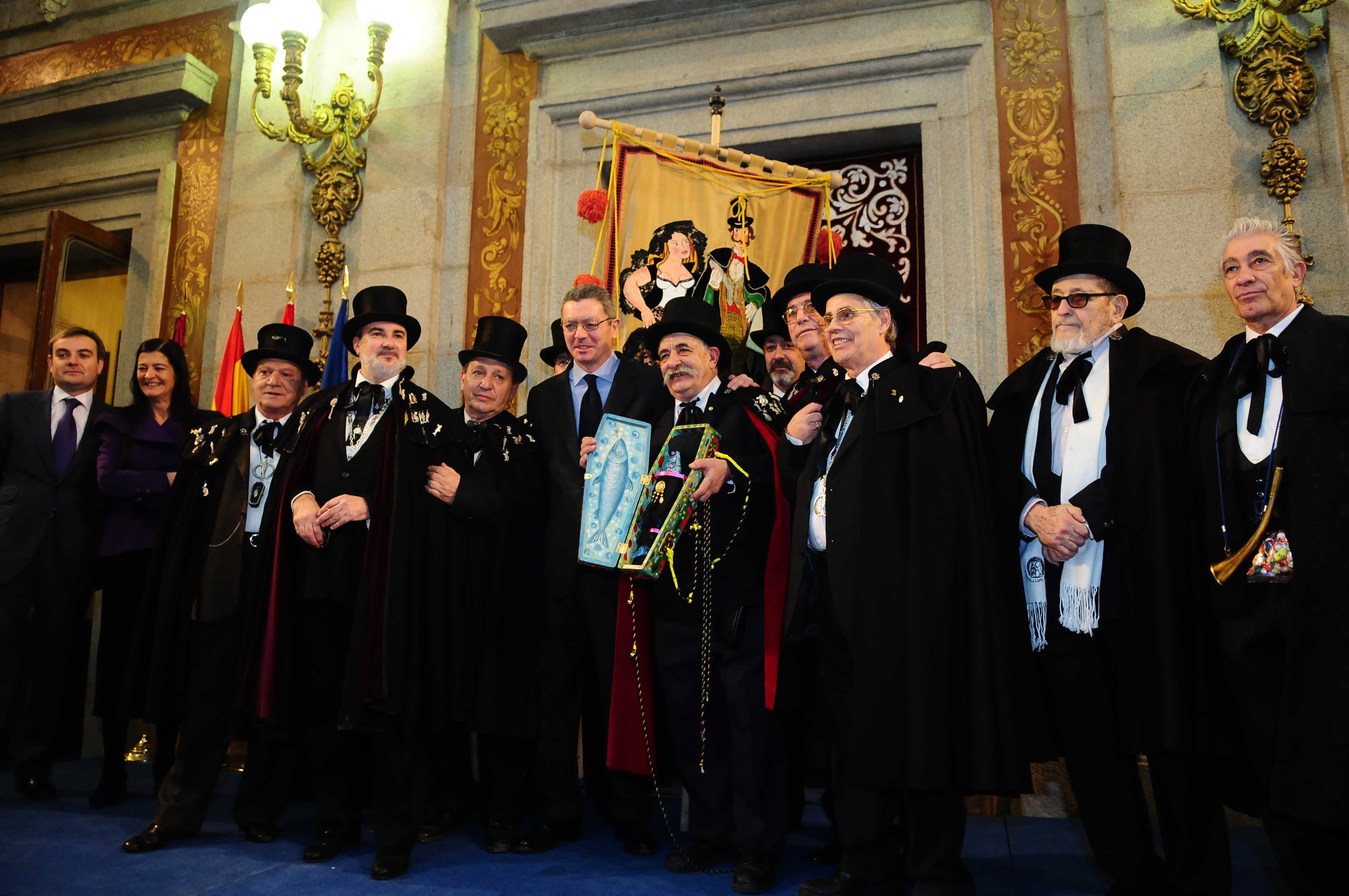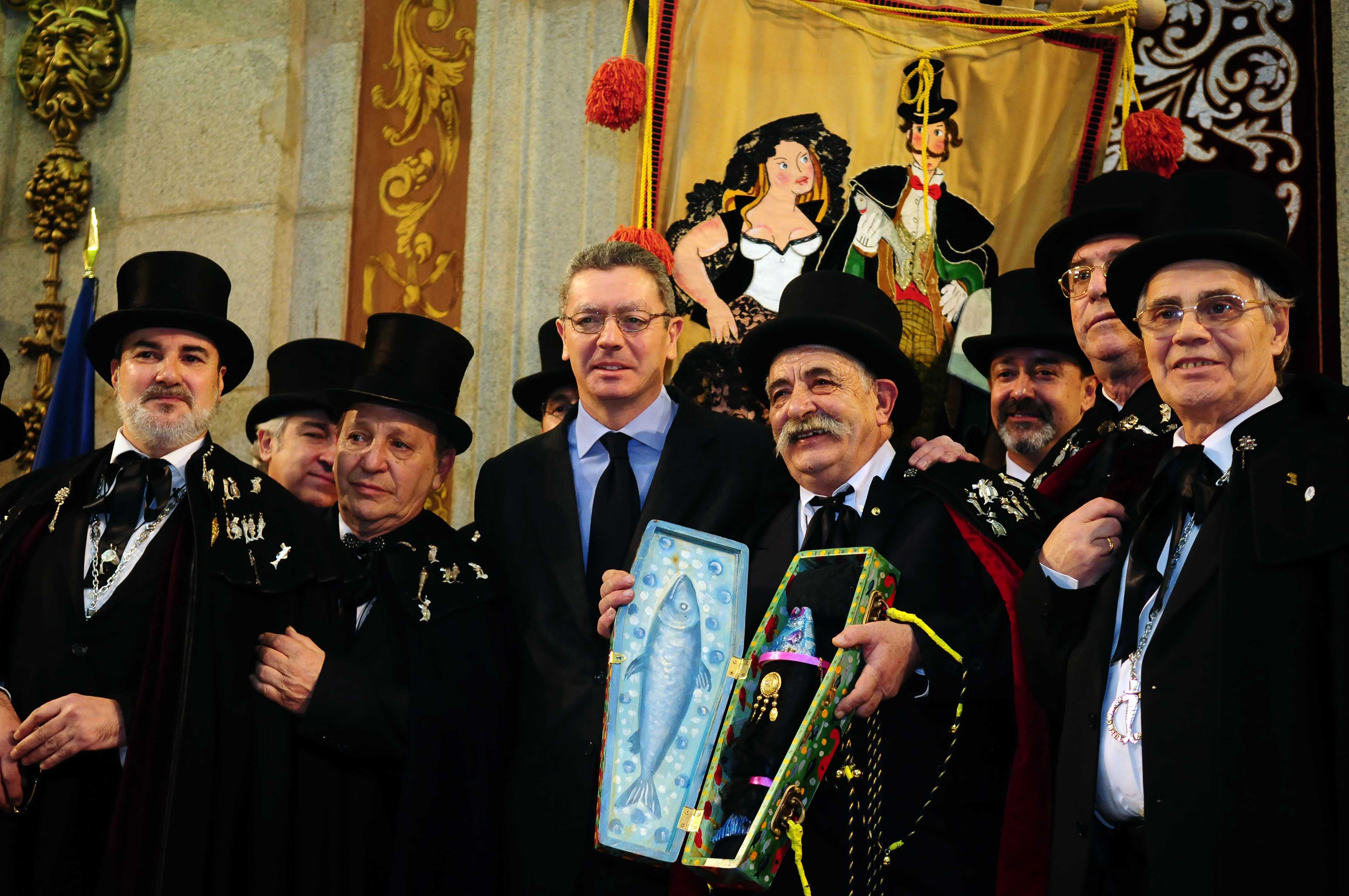 El alcalde, Alberto Ruiz-Gallardón, con los miembros de la Alegre Cofradía del Entierro de la Sardina con los que ha despedido el Carnaval de este año.