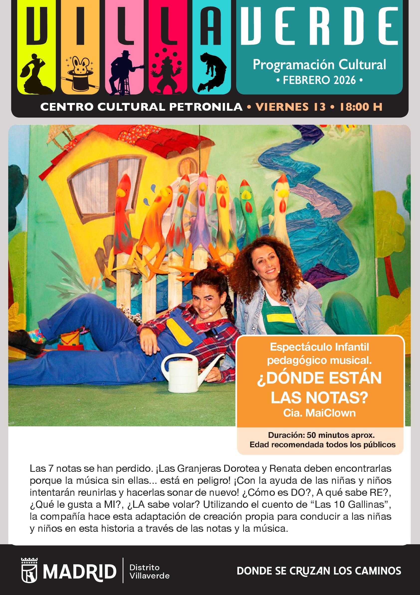 Sinopsis: Las 7 notas se han perdido. ¡Las Granjeras Dorotea y Renata deben encontrarlas porque la música sin ellas... está en peligro! ¡Con la ayuda de las niñas y niños intentarán reunirlas y hacerlas sonar de nuevo! ¿Cómo es DO?, A qué sabe RE?, ¿Qué le gusta a MI?, ¿LA sabe volar? Utilizando el cuento de `Las 10 Gallinas´, la compañía hace esta adaptación de creación propia para conducir a las niñas y niños en esta historia a través de las notas y la música.