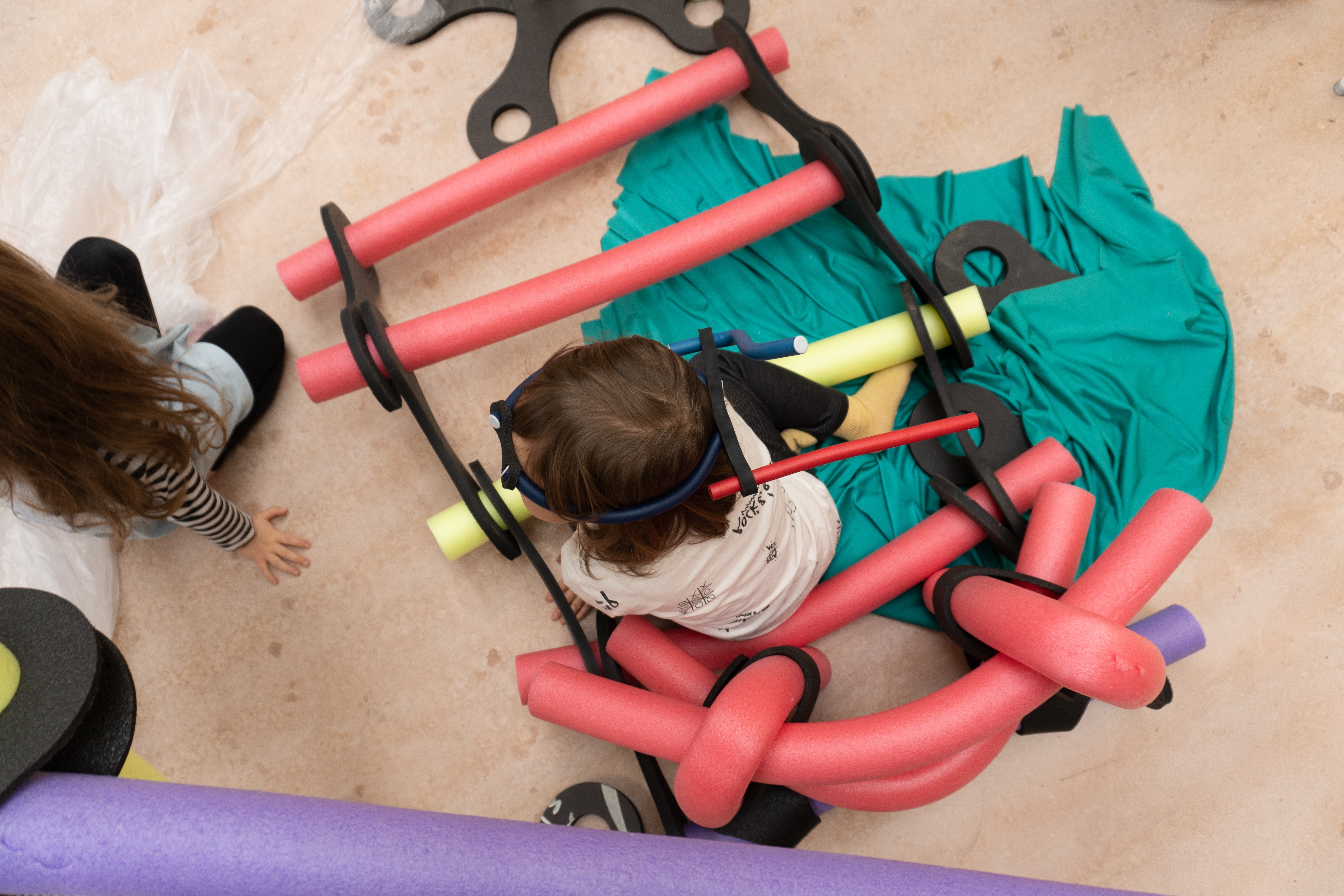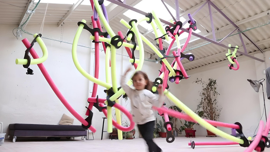 Los 400 m² de la Nave Una de Matadero Madrid serán el escenario de esta propuesta que conecta el juego creativo con las artes, la arquitectura y el diseño, y que invita a visitantes de todas las edades a experimentar con la forma, el espacio y la luz. Mediante un sencillo mecanismo de ensamblaje, los cilindros de espuma, conocidos como ‘churros de piscina’, son la base de este sistema modular que permite construir, conectar y transformar de forma abierta y no estructurada.