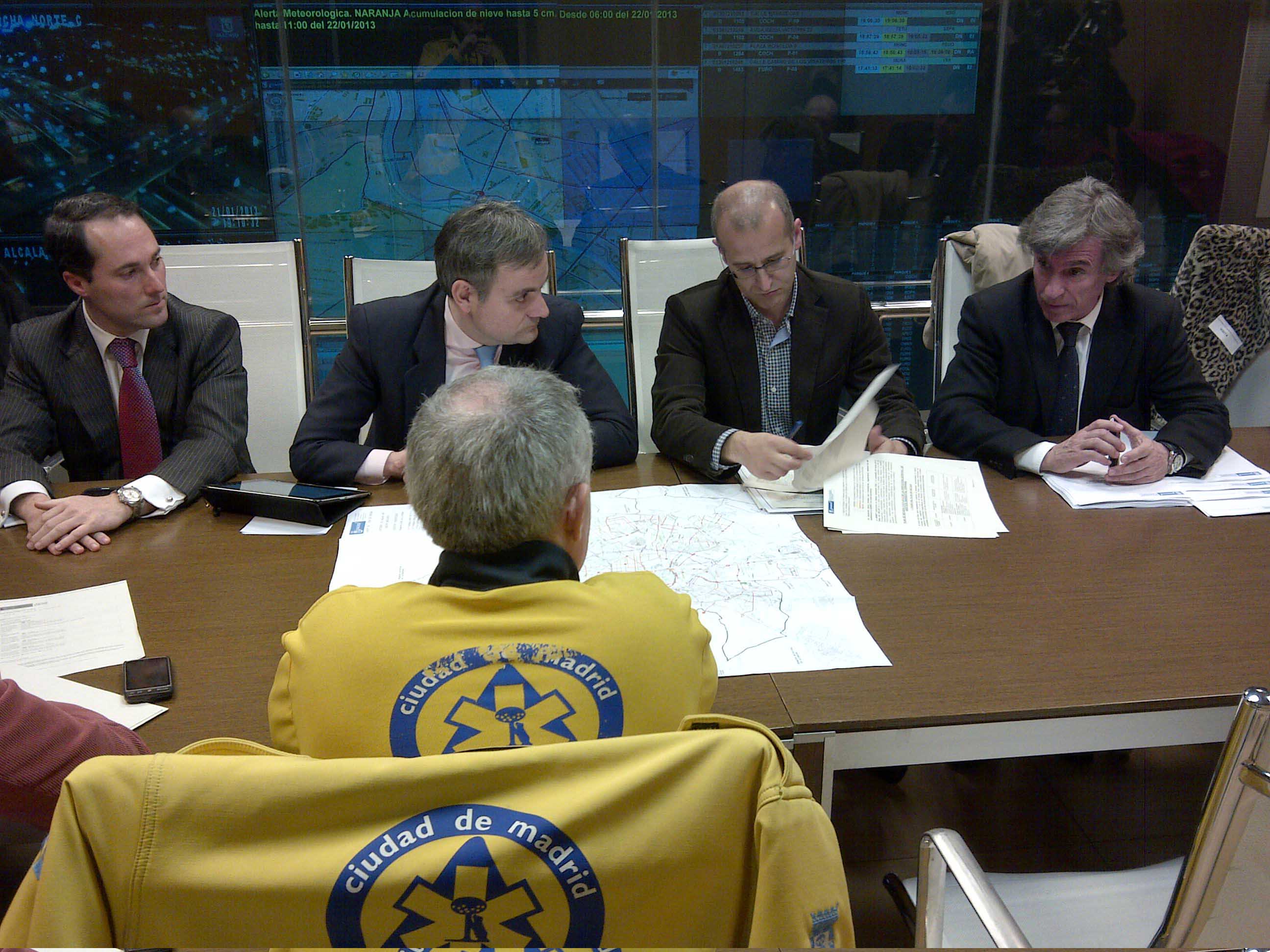 La Agencia Estatal de Meteorología ha activado la Alerta Naranja en el Área Metropolitana de la Ciudad de Madrid donde se prevén nevadas de hasta cinco centímetros en las próximas horas. Enrique Núñez, delegado de Seguridad y Emergencias, se ha reunido esta tarde con el Grupo de Coordinación de Nevadas en la sede del Centro Integral de Seguridad y Emergencias del Ayuntamiento de Madrid (CISEM) para poner en marcha el protocolo de inclemencias invernales.
