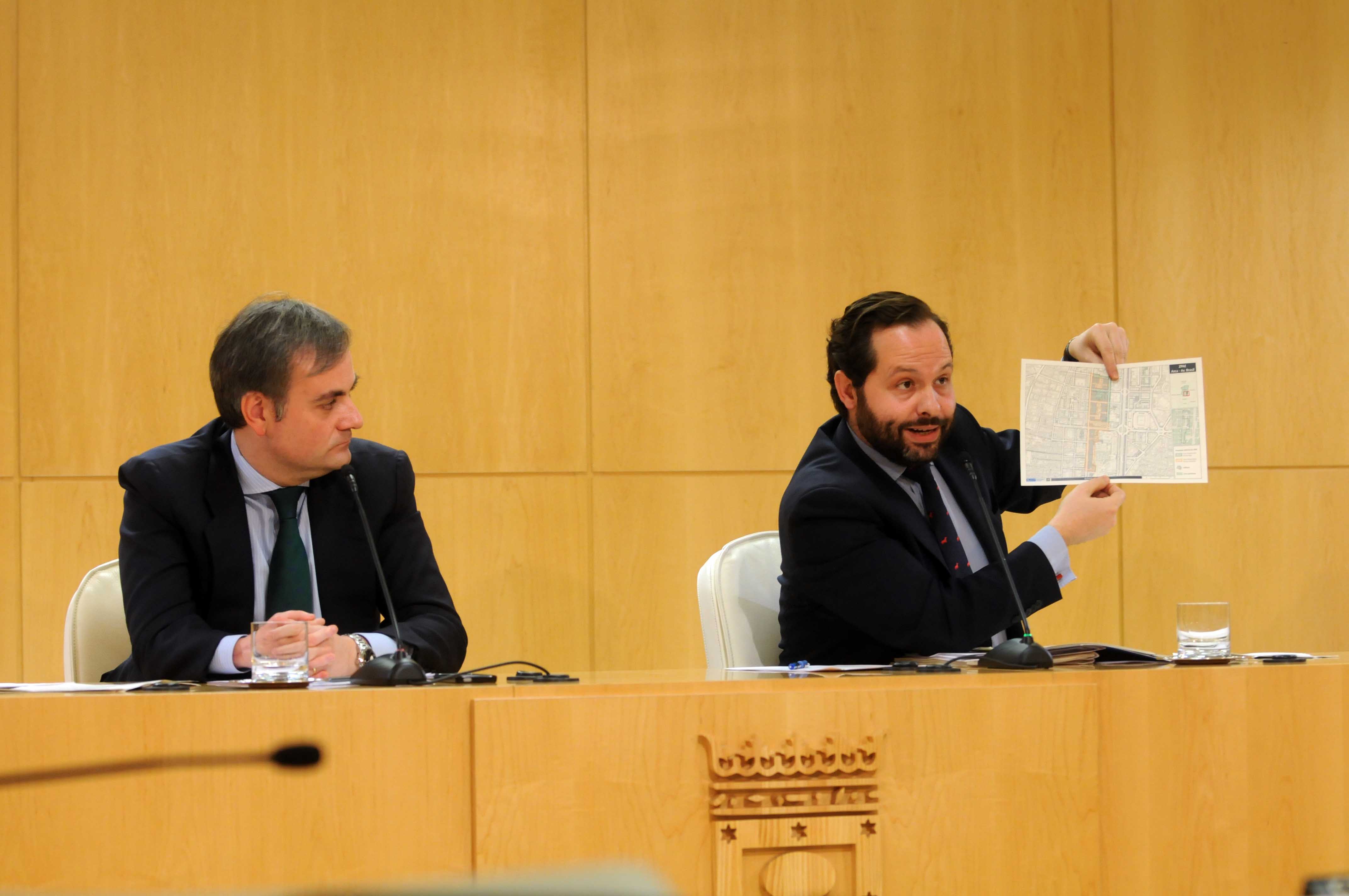El portavoz del Gobierno municipal y delegado de Seguridad y Emergencias, Enrique Núñez, ha presidido hoy la rueda de prensa posterior a la Junta de Gobierno, en la que se ha tratado, entre otros asuntos, la declaración de Zona de Protección Acústica Especial (ZPAE) de Azca-Avenida del Brasil. El delegado de Medio Ambiente, Diego Sajuanbenito, ha explicado los objetivos y detalles de esta declaración./