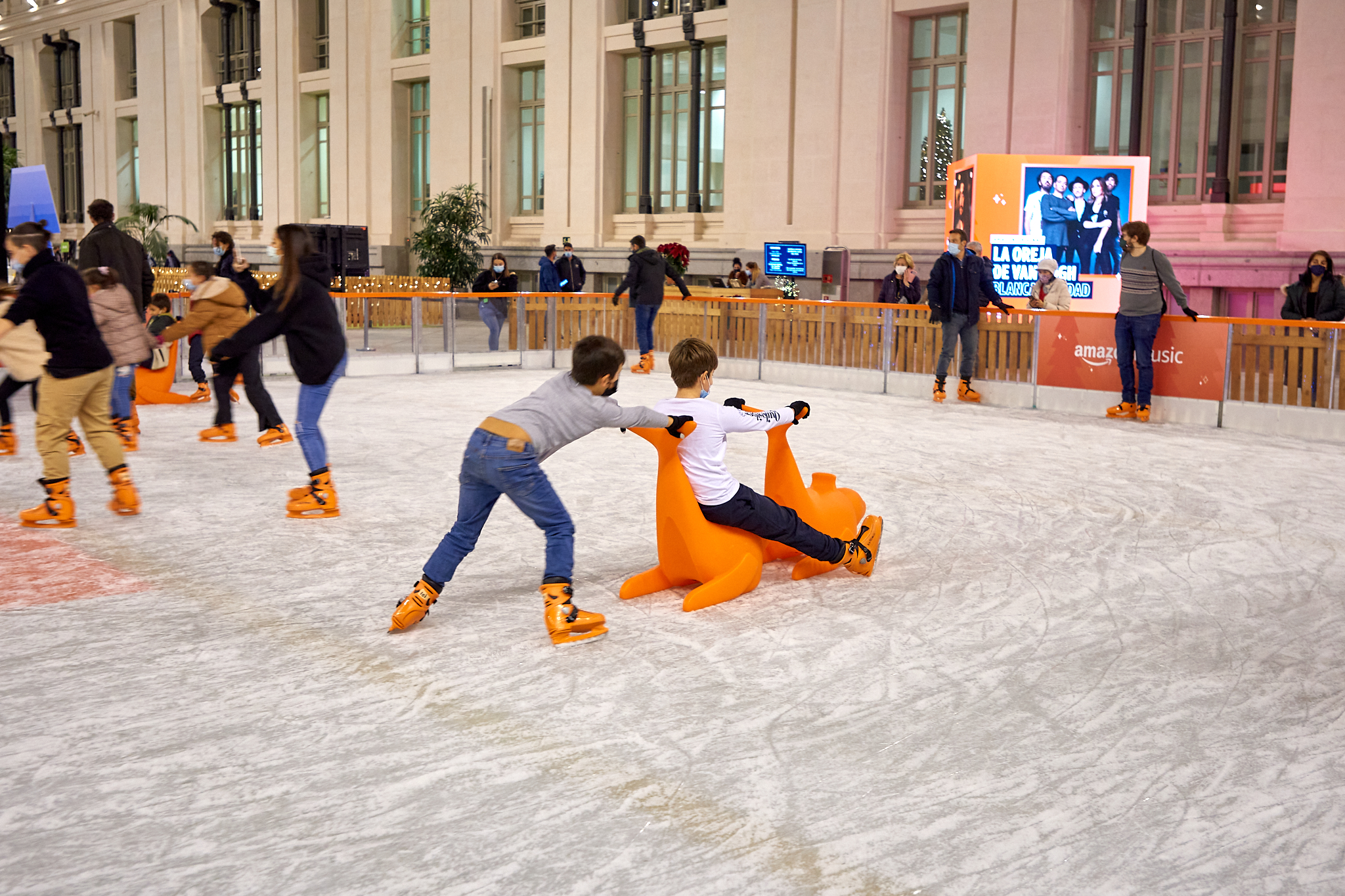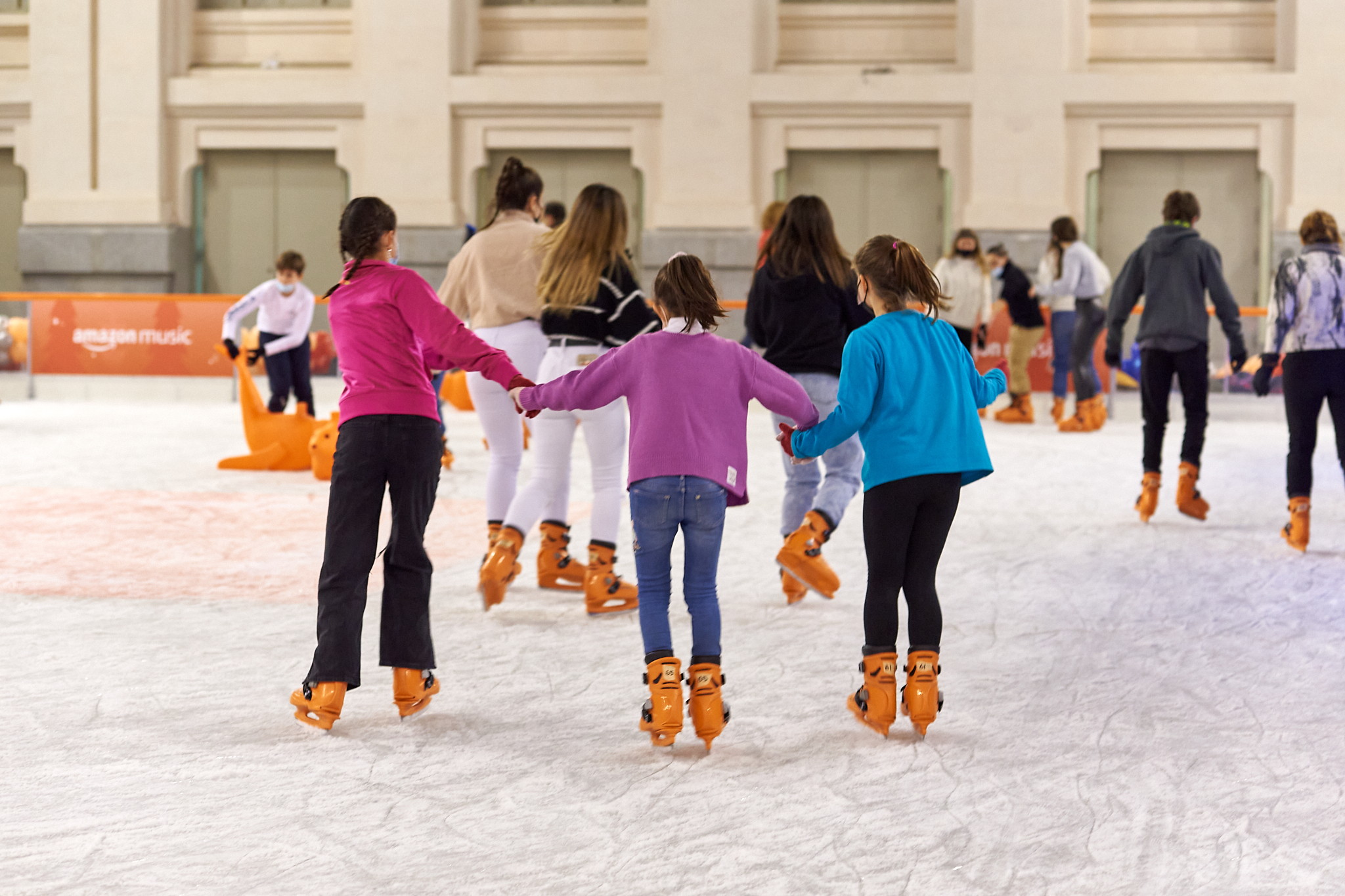 Esta tarde abre al público ‘Cibeles sobre hielo’, la pista de patinaje que instala el Ayuntamiento de Madrid cada Navidad, desde 2012, en la Galería de Cristal del Palacio de Cibeles.