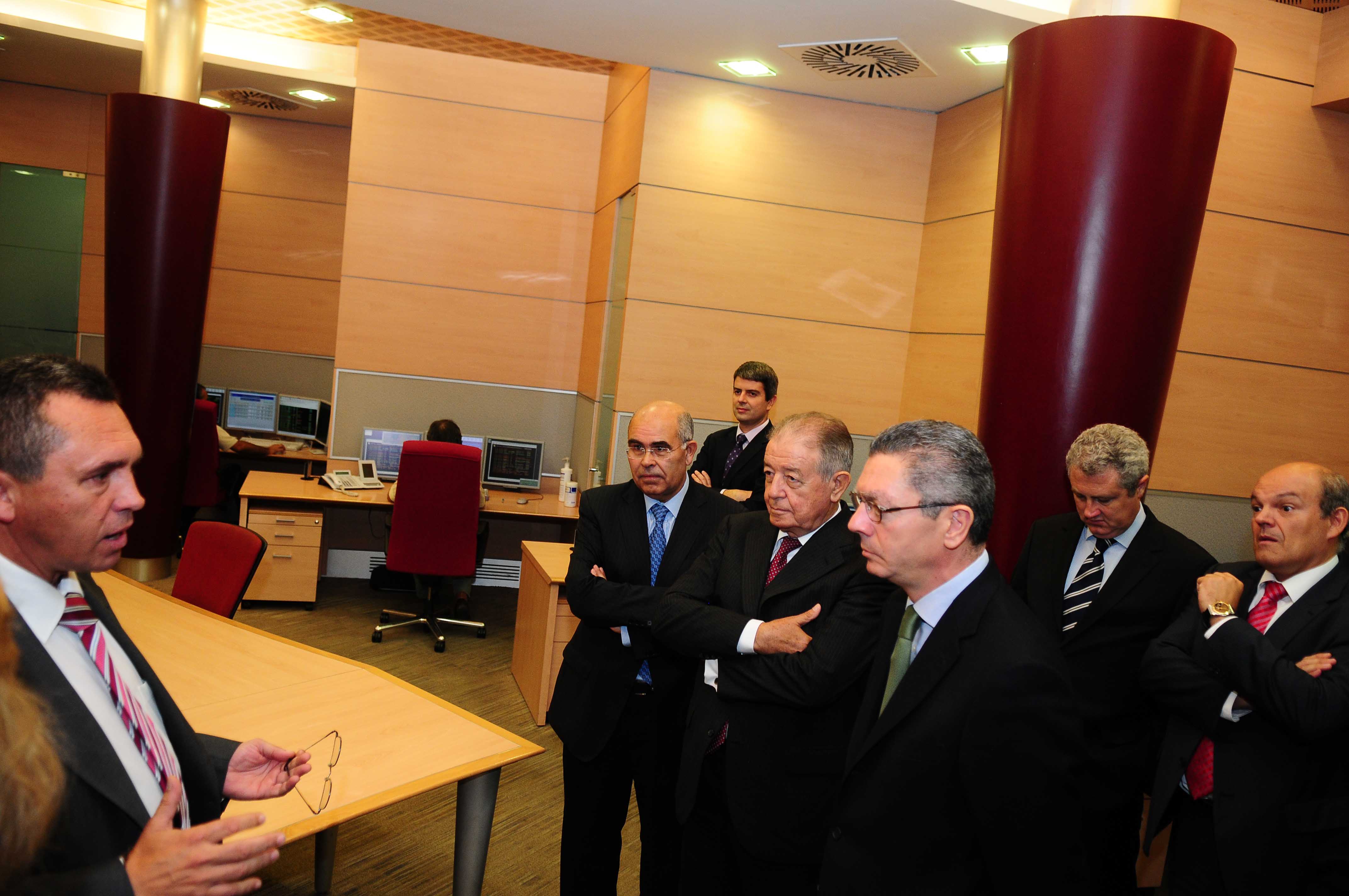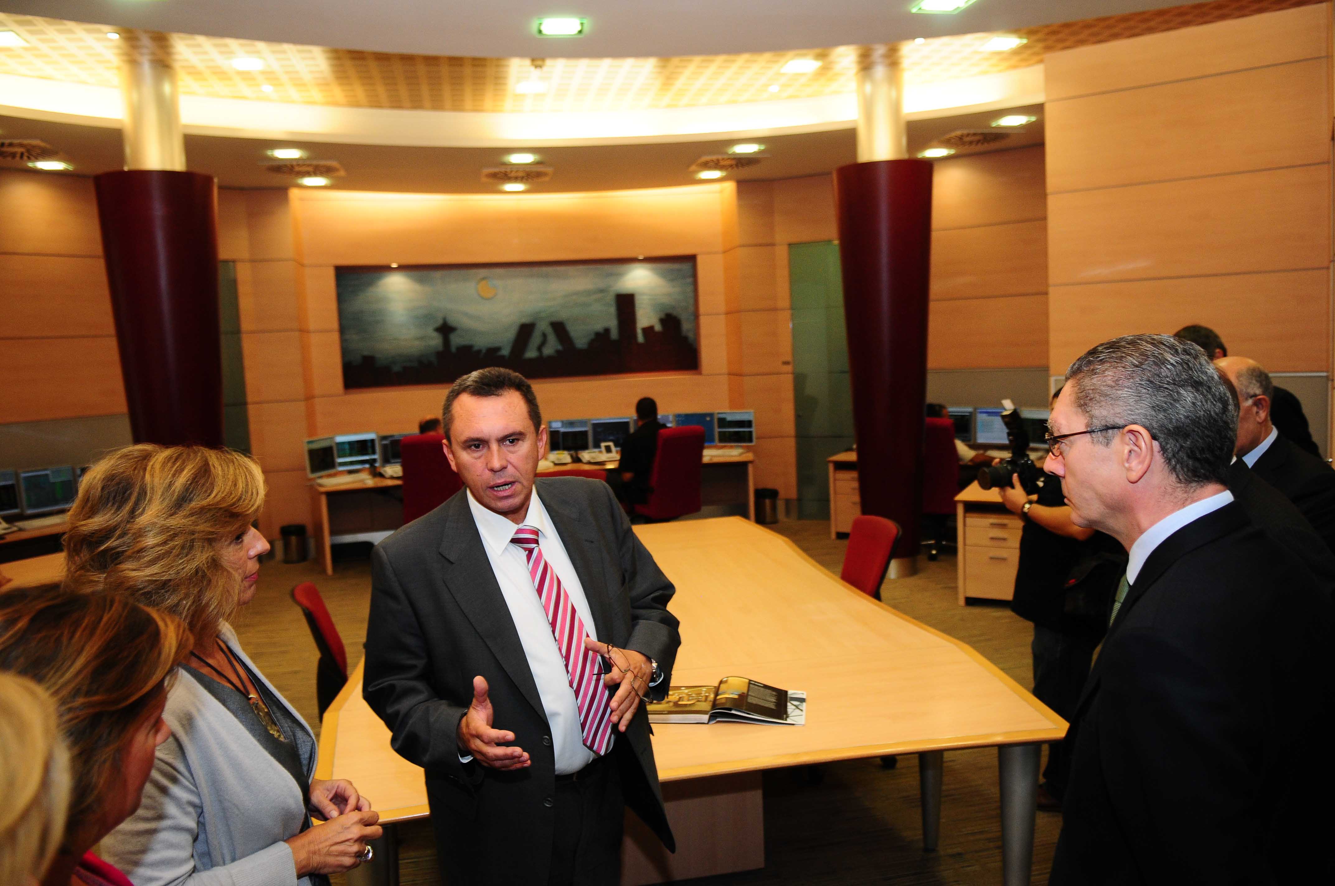 El alcalde de la Ciudad de Madrid, Alberto Ruiz-Gallardón, durante la visita que ha realizado esta mañana al Centro de Control de la Red de Unión Fenosa, en la que ha estado acompañado por el presidente de Gas Natural Fenosa, Salvador Gabarró. También ha estado presente la primera teniente de alcalde y delegada de Medio Ambiente, Ana Botella, y las delegadas de Urbanismo -Pilar Martínez- y de Obras -Paz González-.