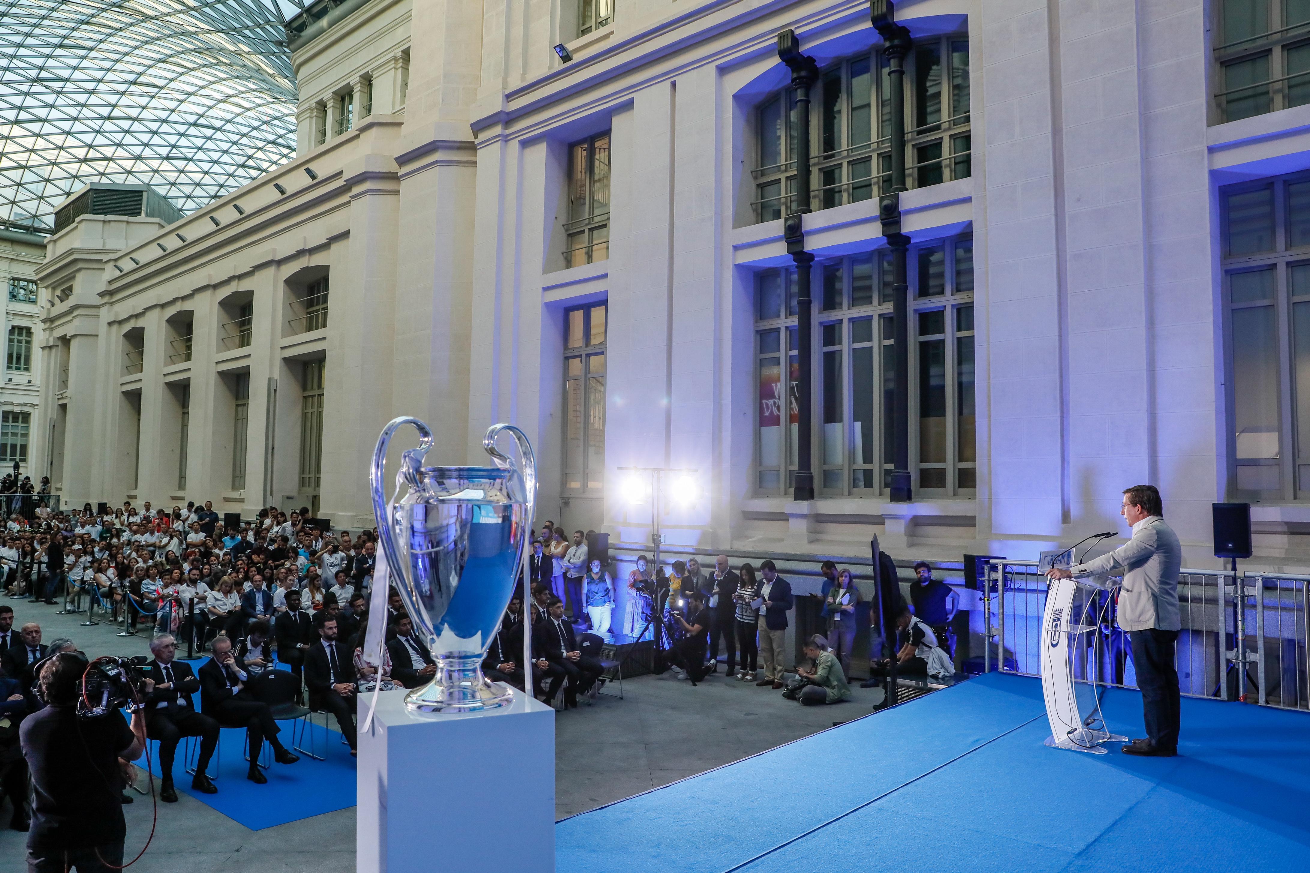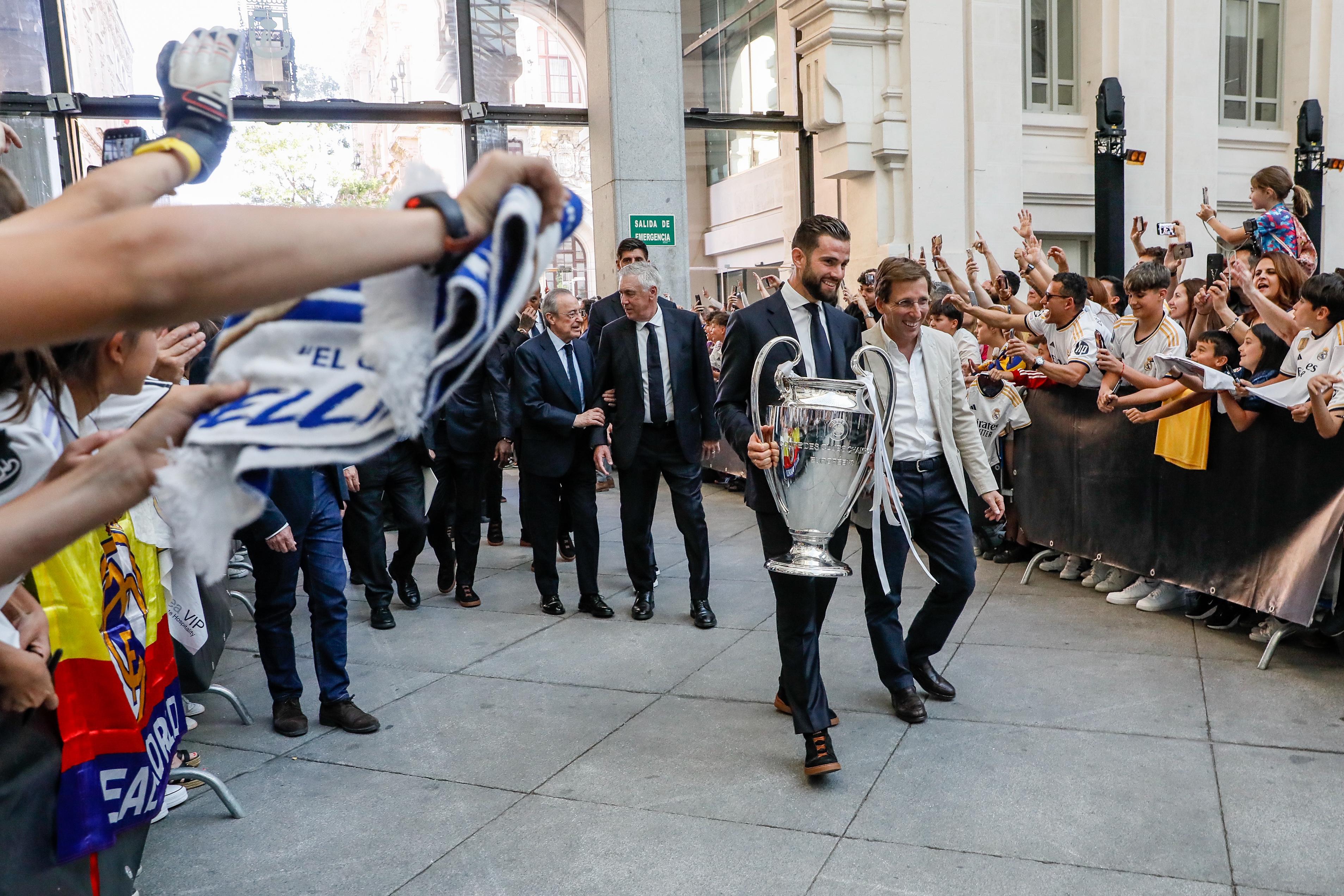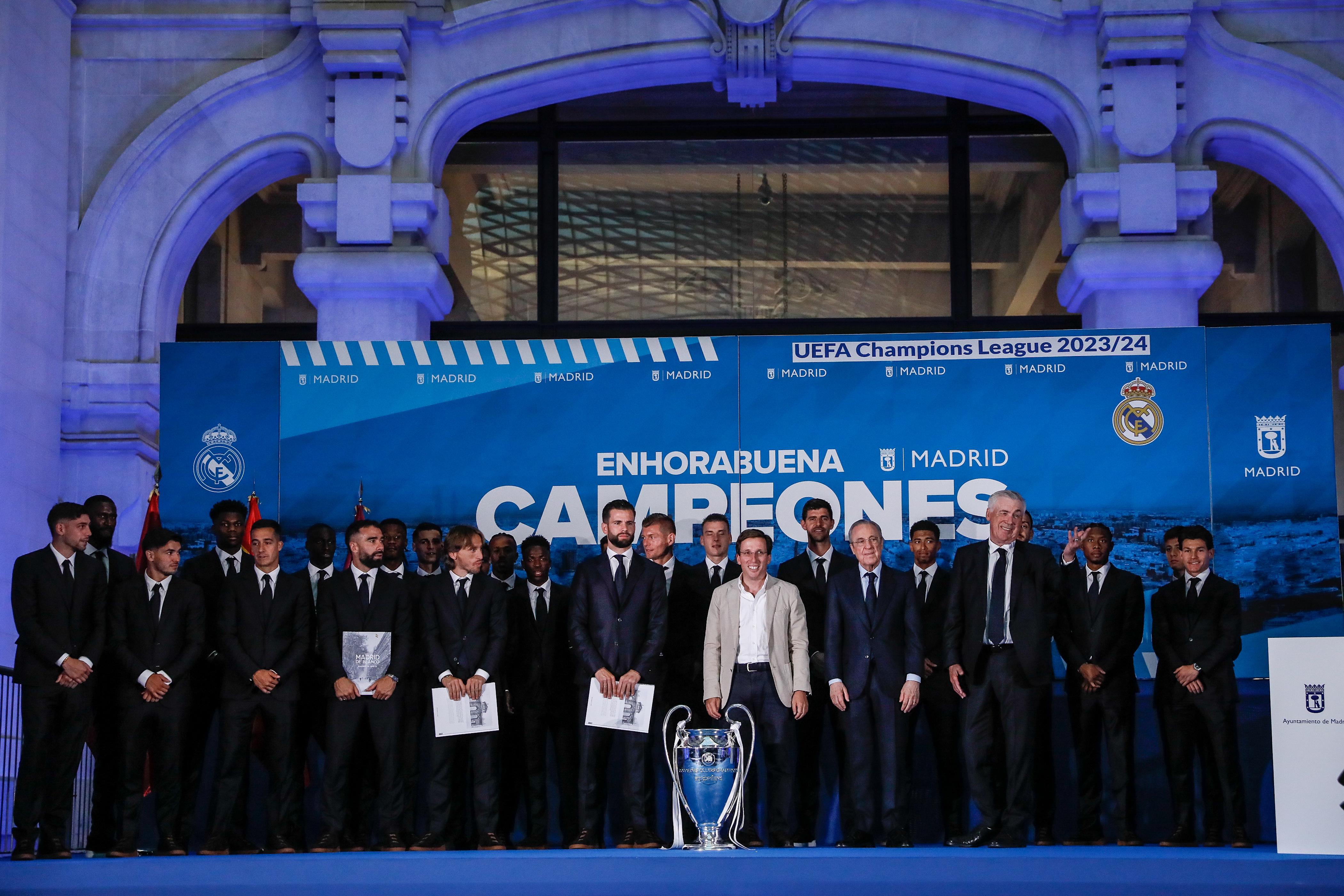El alcalde de Madrid, José Luis Martínez-Almeida, ha recibido esta tarde en la Galería de Cristal del Palacio de Cibeles a los jugadores y a los equipos técnico y directivo del Real Madrid Club de Fútbol, a los que ha felicitado por haber “conseguido volver a asombrar no solo a esta ciudad, sino al mundo” tras ganar la 15ª Champions League.