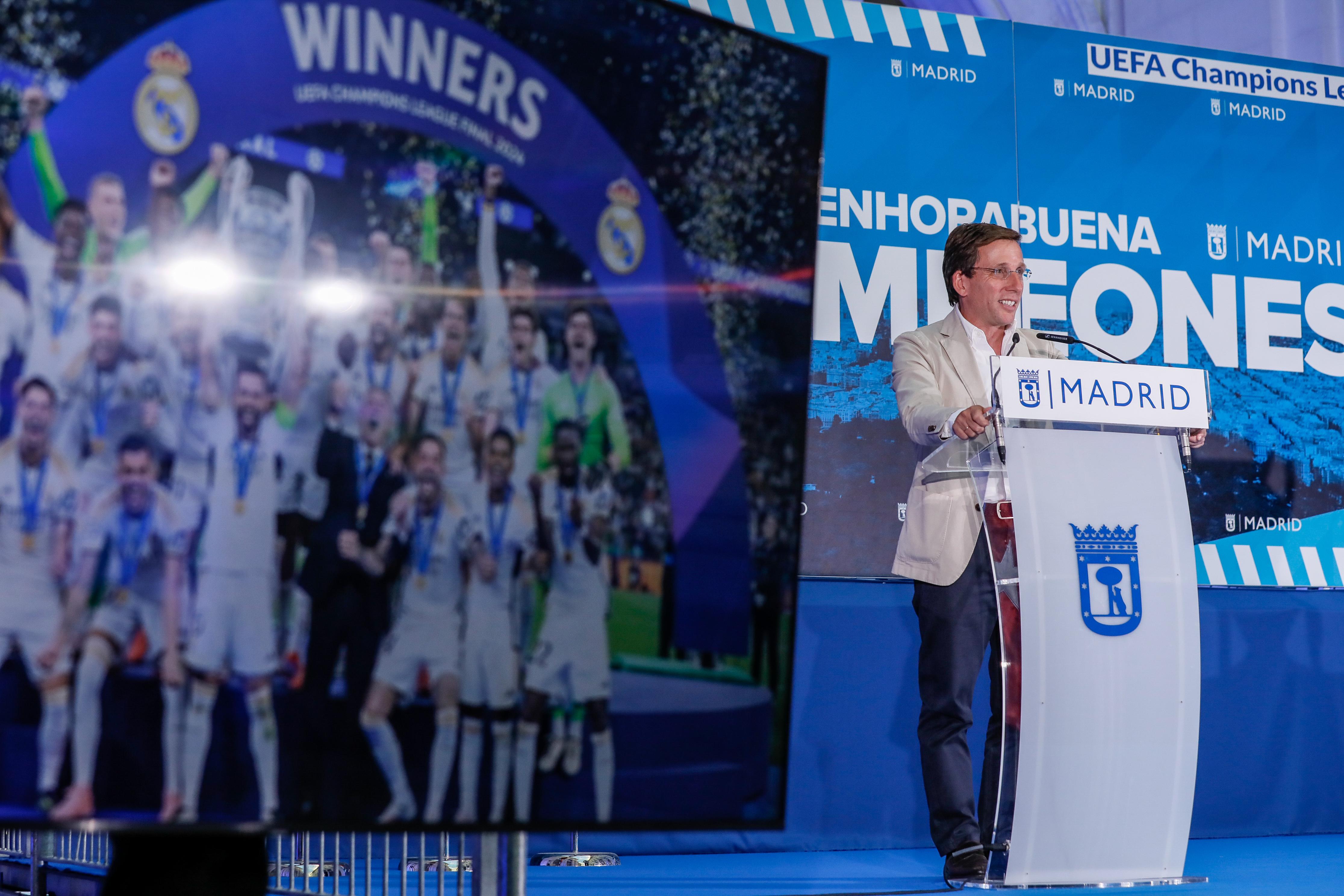 Acompañado por el equipo de Gobierno y representantes de los partidos municipales, Almeida ha calificado de “heroico, hazaña y asombroso” lo logrado por este equipo, “el único que ha ganado seis Copas de Europa en diez años” y al que se ha referido como “icono de esta ciudad” y ha destacado “la naturalidad con la que entendéis en el Real Madrid que ganar es una forma de entender la vida y es una obligación inherente a llevar esa camiseta y ese escudo”. El alcalde ha predicho que antes de que acabe su mandato, en 2027, “estaréis aquí con la decimosexta”.