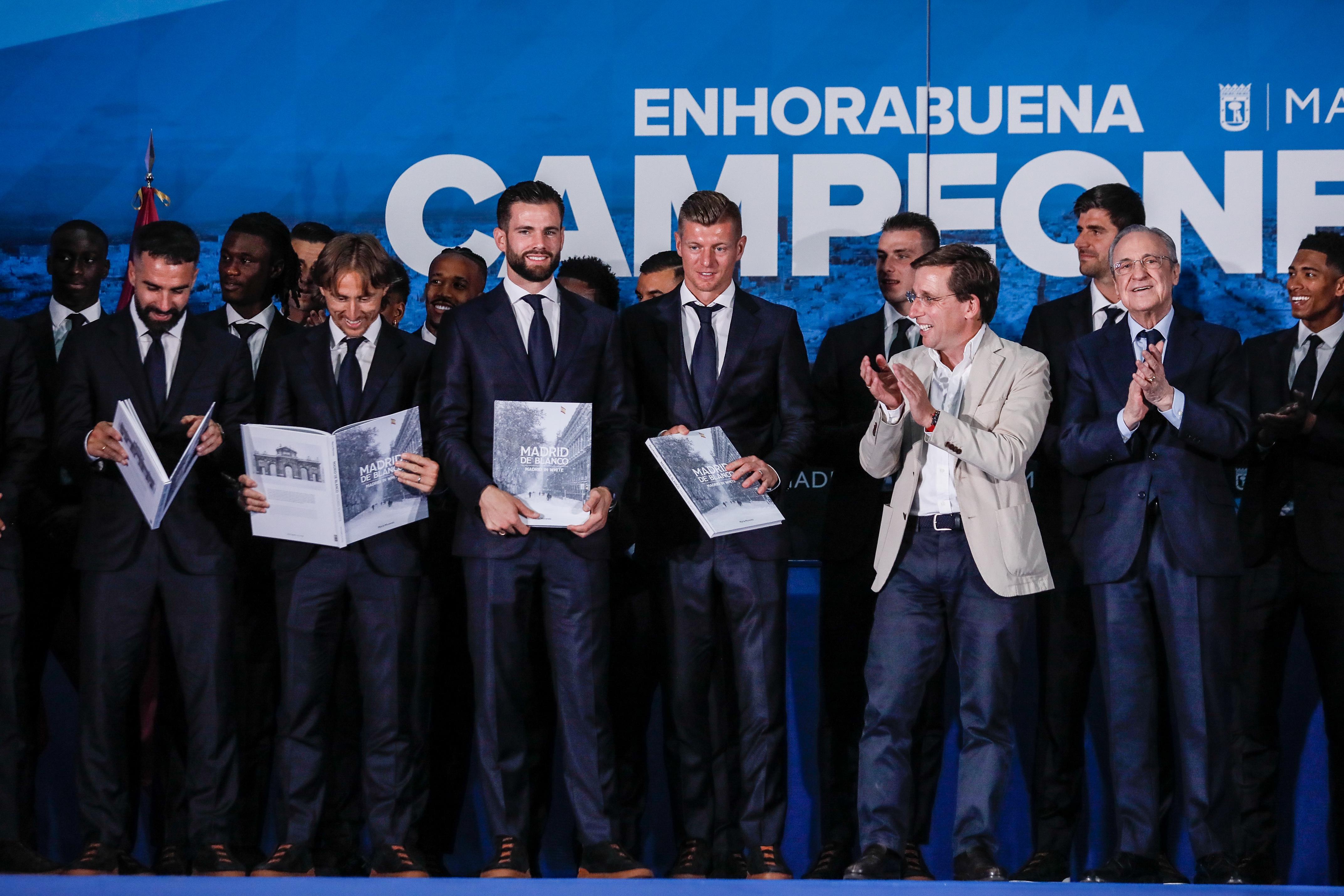 Durante la recepción, el presidente del Real Madrid, Florentino Pérez, ha ofrecido a Almeida una réplica del trofeo de la Champions y el capitán del equipo, Nacho Fernández, le ha hecho entrega de una camiseta conmemorativa de este título firmada por todos los jugadores del equipo, además de otra personalizada. A su vez, el alcalde de la capital ha entregado una menina al presidente del club y un recuerdo a los cuatro jugadores que han conseguido su sexta Champions, Kroos, Modric, Carvajal y Nacho. /